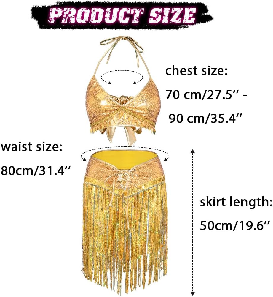 Sparkly fringe skirt length is 50 cm/19.6'' and the waist size is 80 cm/31.4''for almost women. Lace up dance skirt can be adjusted to a larger waist circumference through ties. The lower chest circumference of the crop top is 70 cm/27.5'' to 90 cm/35.4''.