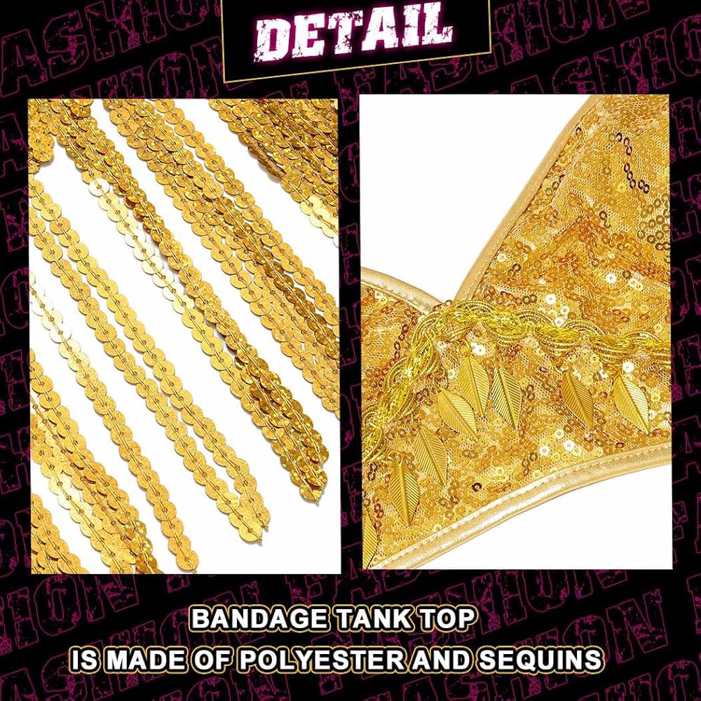 Bandage tank top is made of polyester and sequins. Lightweight and easy to wear. Available in gold and silver colors.
