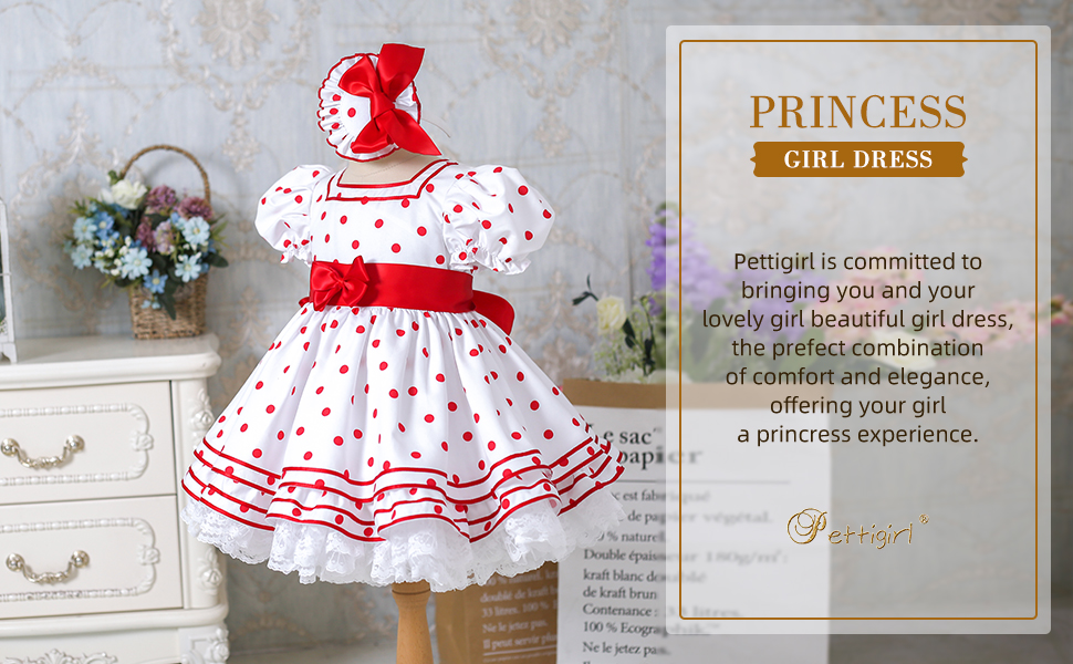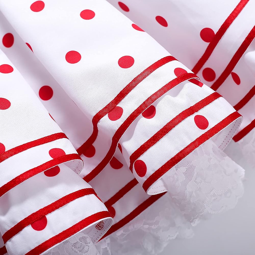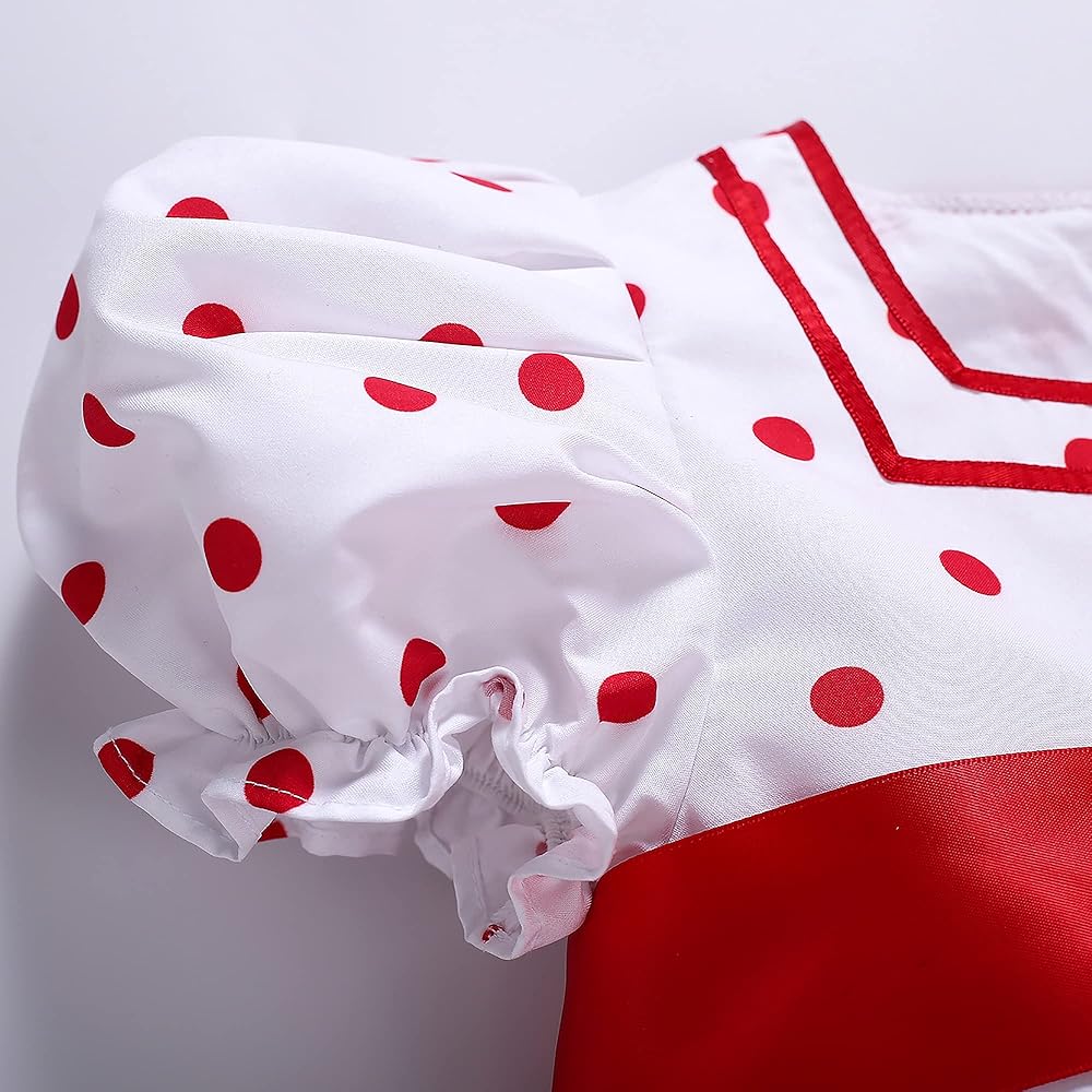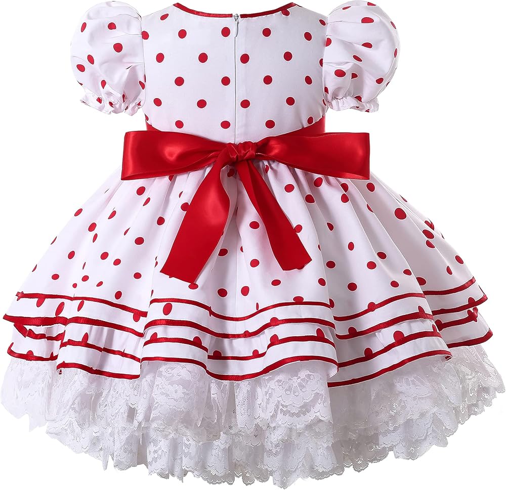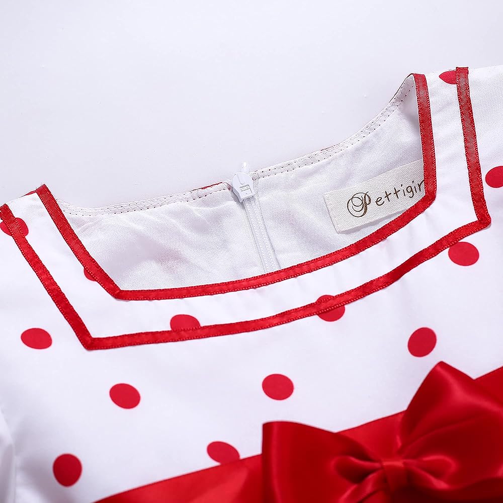 - نمط جميل منقط باللون الأحمر. زخرفة من الدانتيل المكشكش حول حاشية الفستان. القوس الأحمر الكبير على الظهر.