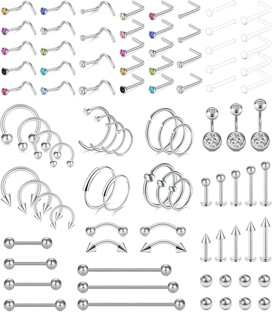 [العبوة] 14 قطعة من براغي الأنف، 14 قطعة من مسامير الأنف على شكل حرف L، 10 قطع من مسامير الأنف الشفافة، 8 قطع من حلقات حاجز حدوة الحصان، 9 قطع من حلقات الأنف، 3 قطع من حلقات الخرز الأسيرة، 10 قطع من حلقات الشفاه، 4 قطع من حلقات الحواجب المنحنية، 4 قطع من حلقات اللسان، 3 قطع من الأثقال الصناعية ، 3 قطع من حلقات زر البطن، 8 قطع من كرات الثقب البديلة