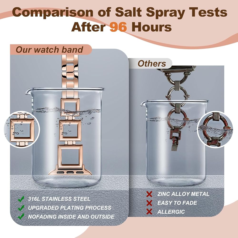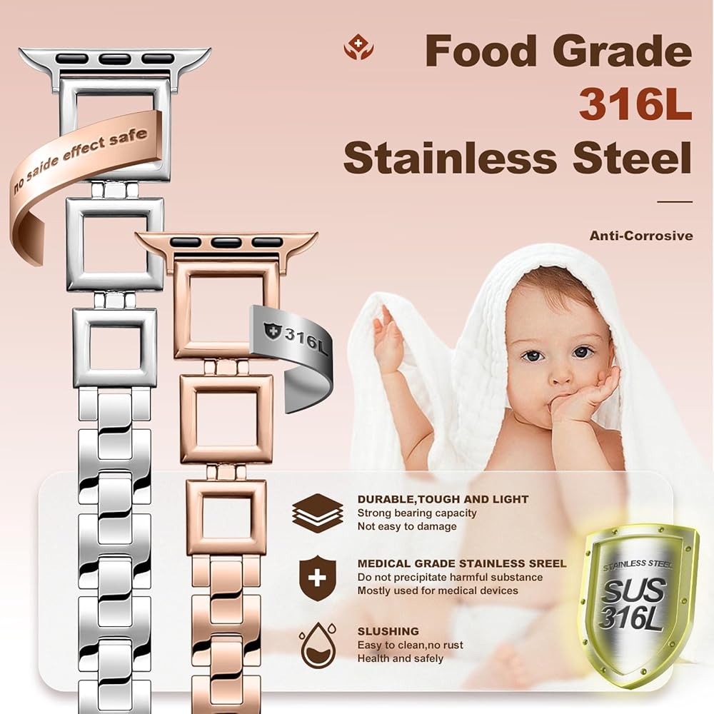 ⌚【فولاذ مقاوم للصدأ 316 مسامي ومريح】سوار ساعة التفاح الذهبي الوردي مصنوع من الفولاذ المقاوم للصدأ 316L عالي الجودة، وهو الأكثر استخدامًا في التكنولوجيا العالية. يتميز الفولاذ المقاوم للصدأ 316L بأنه مقاوم للغاية ويوفر لمسة نهائية ممتازة بمجرد صقله، مما يحافظ على جماله حتى في البيئات القاسية. بعد اختبارات التآكل الطويلة التي أجراها العديد من الأشخاص، أصبح سوار ساعة التفاح الذهبي من DMMG خاليًا من النيكل وغير مهيج ويمنع الطفح الجلدي.