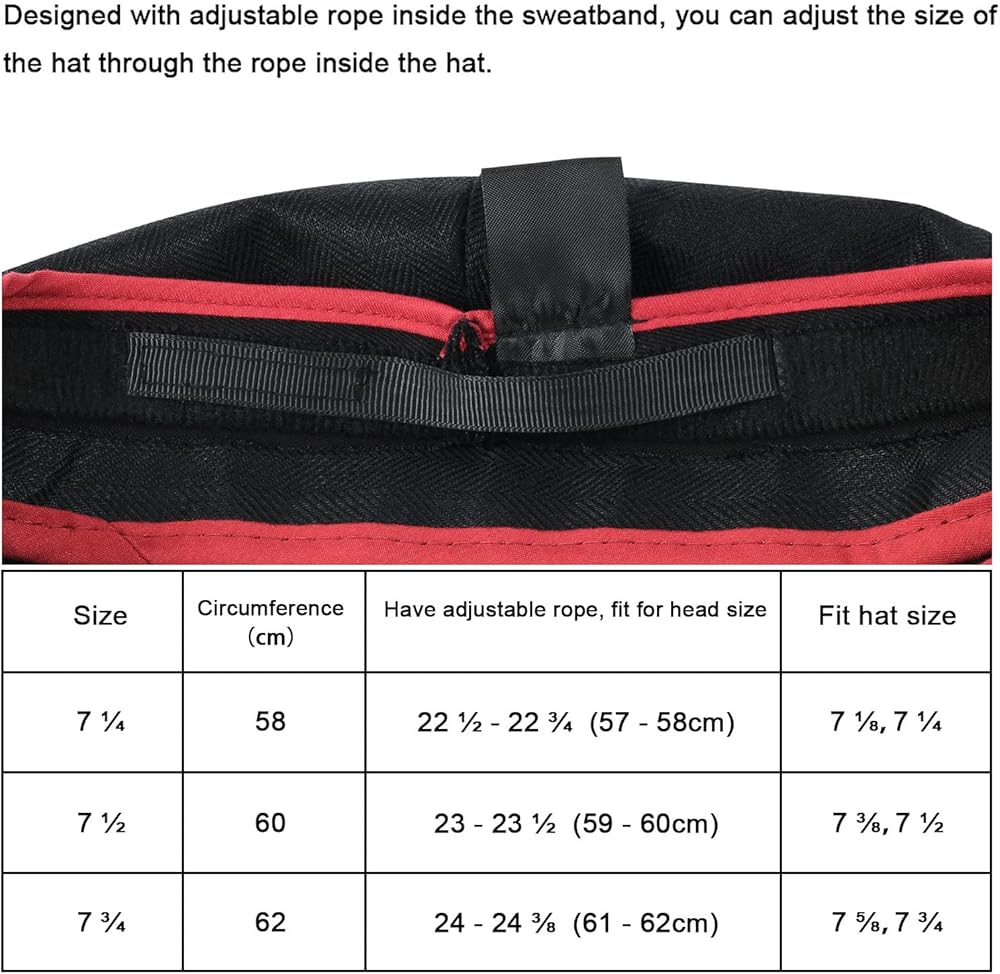 • المقاس: 3 مقاسات متاحة 7 1/4، 7 1/2، 7 3/4. يتم القياس حول الجزء الداخلي للقبعة، ويبلغ مقاس التاج حوالي 4.3 سم عمقًا وحافة 2 سم.