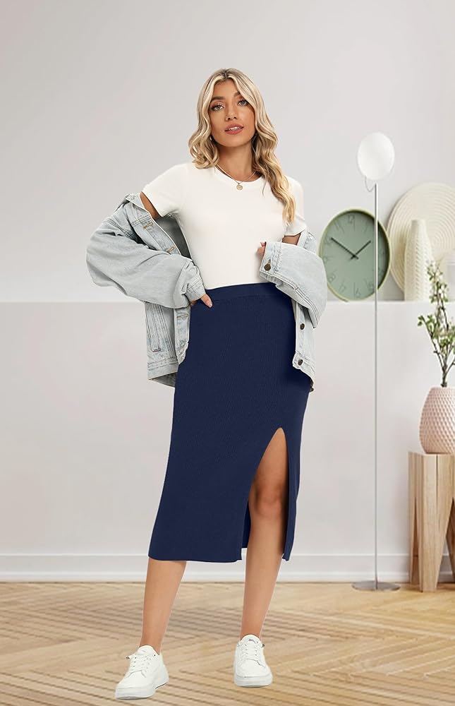 • المزايا: تنورة ضيقة عالية الخصر، بفتحة جانبية، محبوكة. نسيج محبوك مضلع، ناعم وقابل للتمدد.
