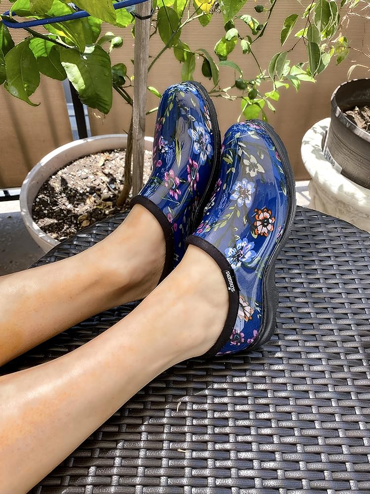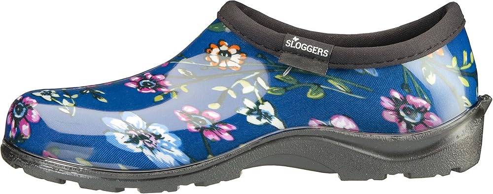 Slip into waterproof comfort with Sloggers Ditsy Spring Print Blue rain and garden shoe. Features our "All-Day-Comfort" insoles for maximum comfort and our signature deep lug tread for great traction. Easy-on and easy to clean-up. You'll soon know why Sloggers are America's #1 Backdoor Shoe. Note: prints may vary slightly from shoe to shoe. Women's 6 -11. Proudly Made in the USA from US and imported parts