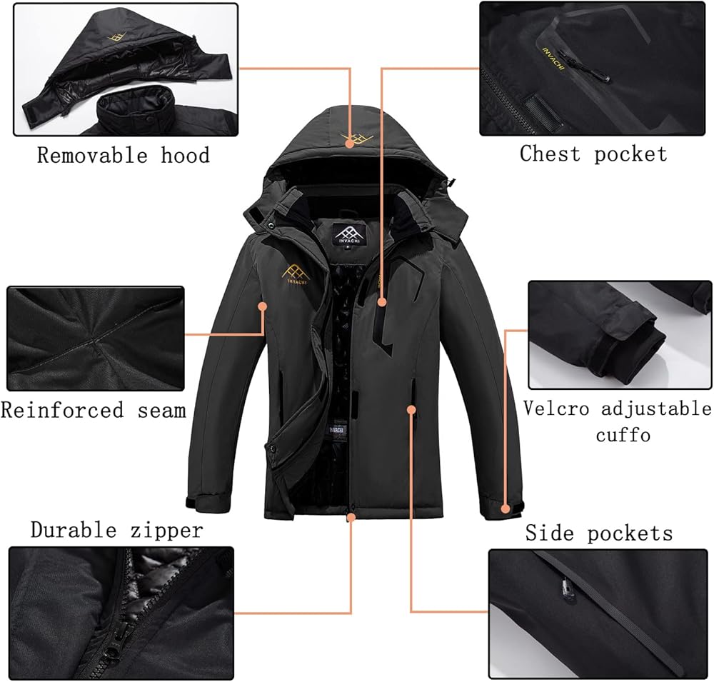 INVACHI ski jacket will make you feel comfortable and stay dry in cold weather.The craftsmanship is decent with no visible flaws, clean stitching and smooth, snag-free metal zippers. The main front zipper is the best quality which is a sign of quality.