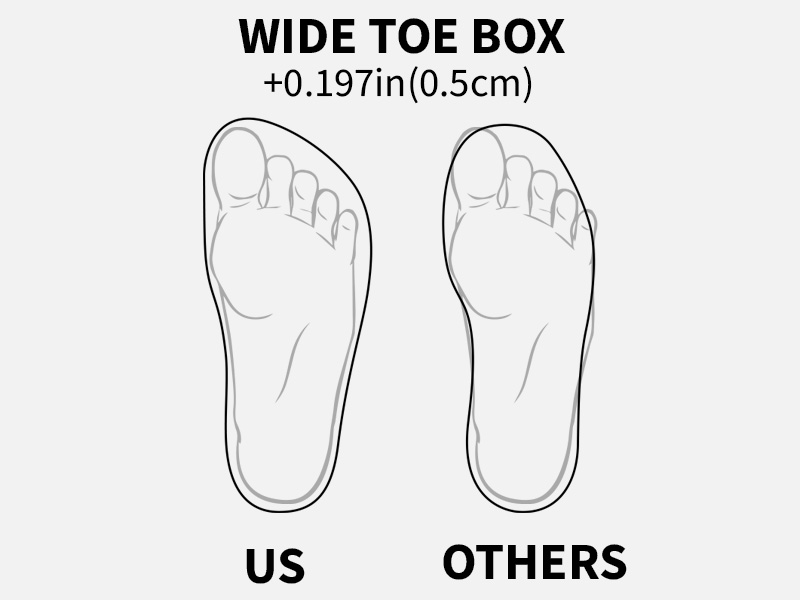 [صندوق عريض لأصابع القدم] -- بالمقارنة مع أصابع أحذية الجري التقليدية، فإن أحذية الرجال حافي القدمين تتميز بتصميم أوسع لأصابع القدم. تتميز أصابع القدم بمساحة أكبر، بحيث تتمتع القدم بقبضة أفضل وشعور القدم، وفي الوقت نفسه، لن تتشوه أصابع القدم بسبب الضغط.