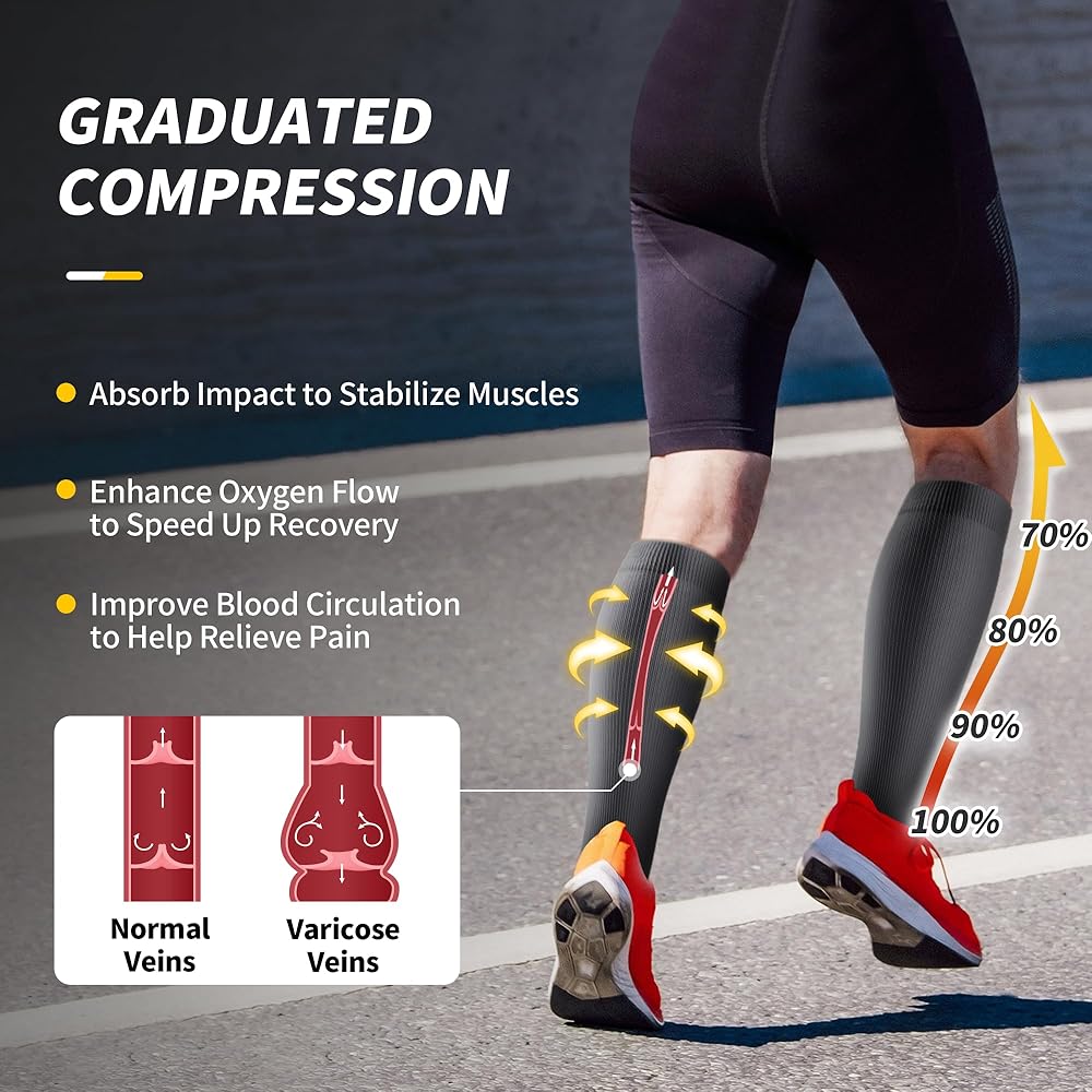 • تعزيز الدورة الدموية والدعم: تتميز بضغط متدرج 15-20 مم زئبق، هذه الجوارب النسائية والرجالية تعزز تدفق الدم، وتقلل من التورم والتعب في ساقيك؛ منع تجمع الدم والتخثر. تسريع عملية التعافي بعد التمرين؛ تخفيف الألم الناتج عن الدوالي، وشظايا الساق، وتشنجات الساق