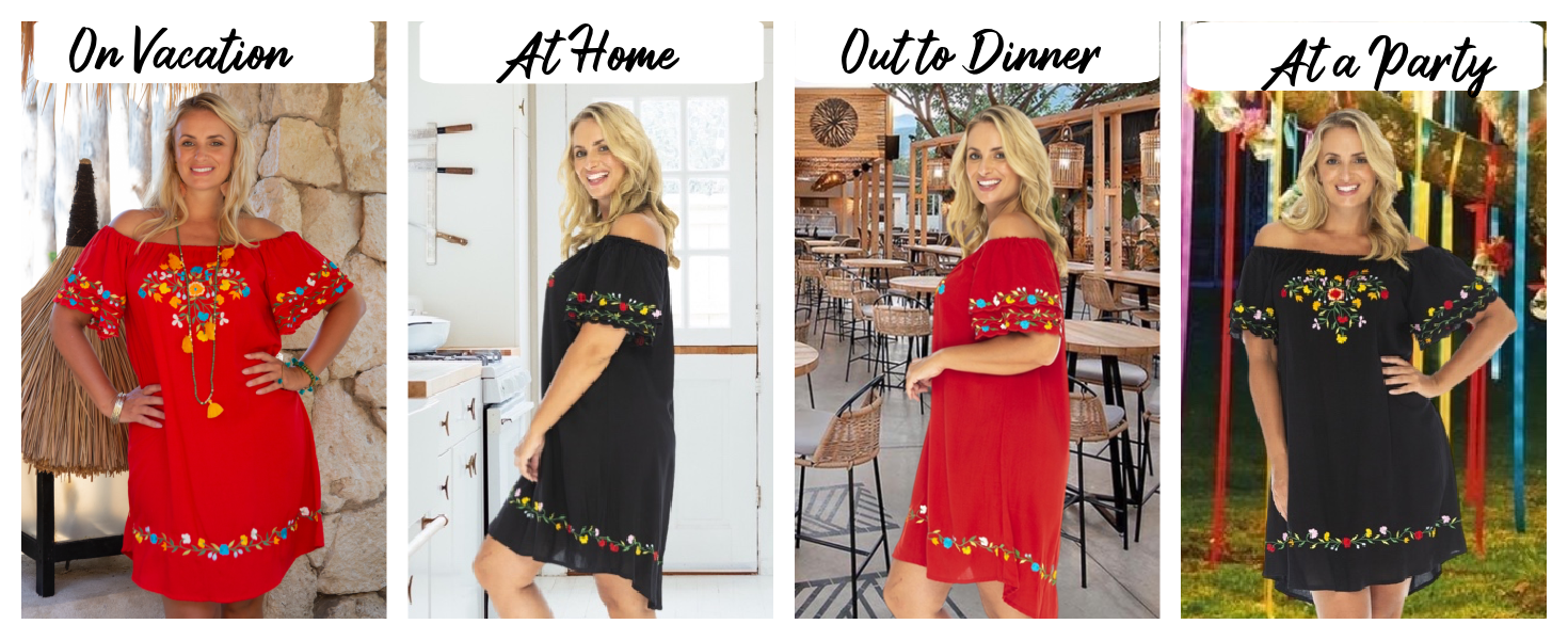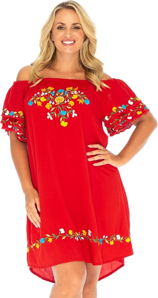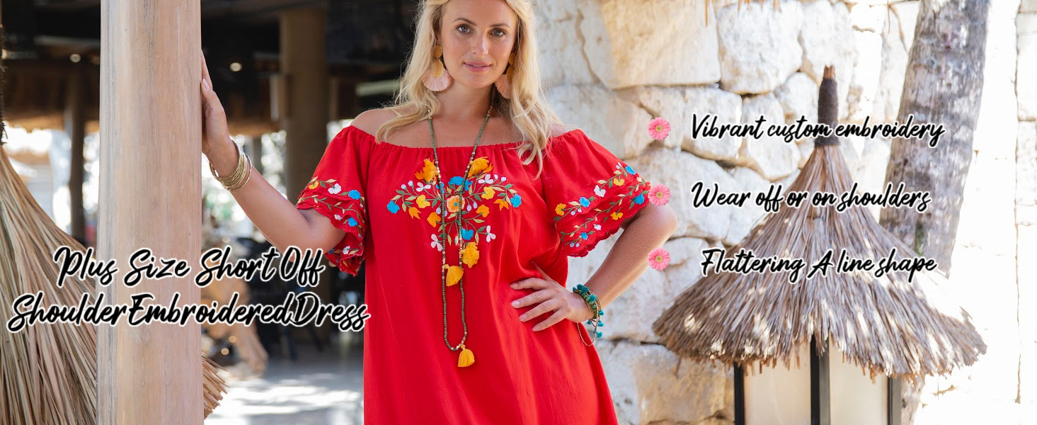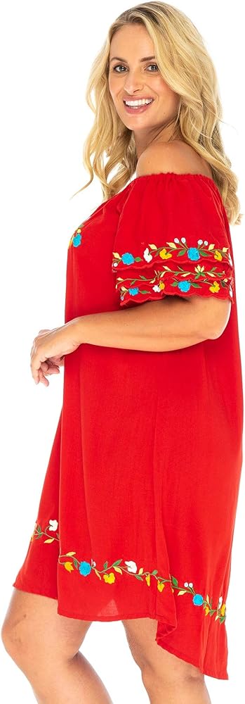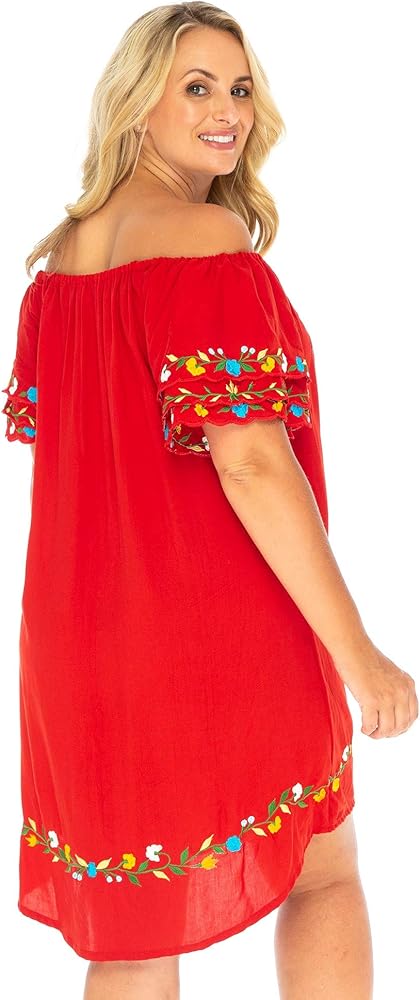 تطريز زهور مخصص نابض بالحياة وملاءمة فضفاضة تجعل هذا الفستان الجميل ذو اللون الأحمر المكسيكي المستوحى من البوهو مقاس كبير هو التحول الصيفي القصير المثالي أو غطاء ملابس السباحة. حاشية مرتفعة ومنخفضة جذابة