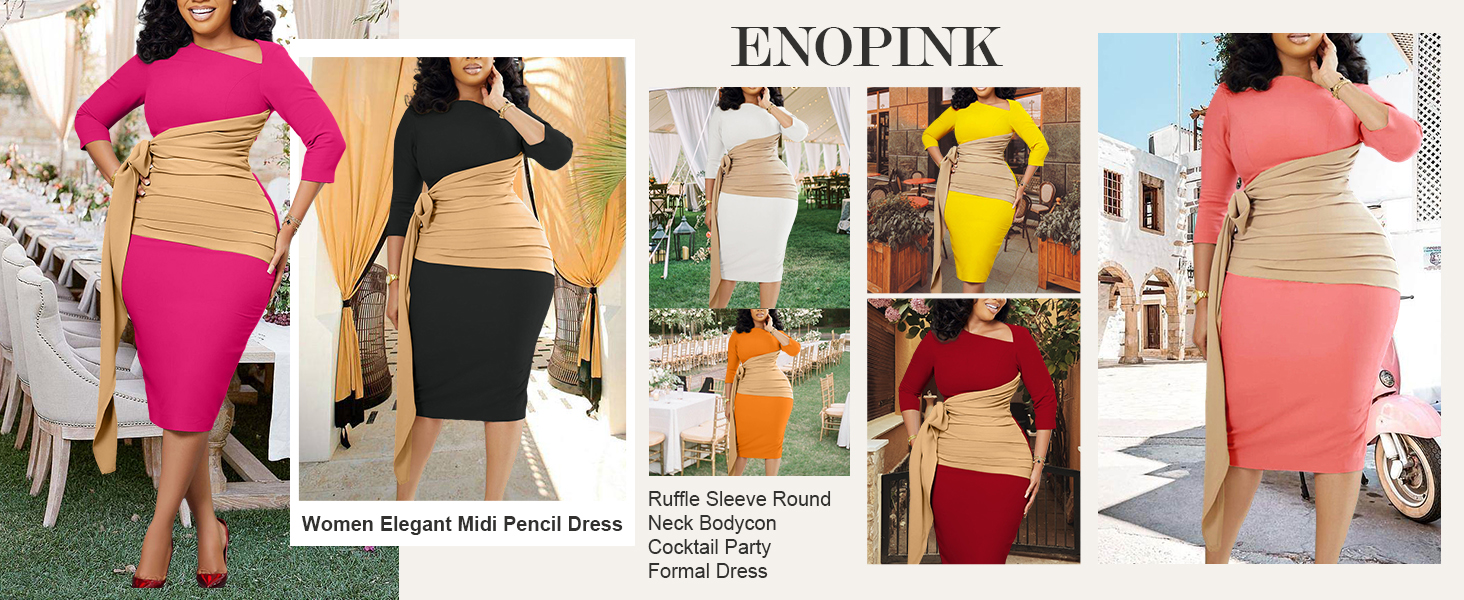 السمات: كشكش على الجانب يغطي خط الجسم ليبدو أنحف، خصر عالي، جسم مثير، كشكشة جانبية، مرقع، فستان بينيكل للأعمال، فستان متوسط الطول، الجزء المطوي على الخصر سوف يتدلى قليلاً إذا كان الجزء العلوي من الجسم رقيقًا .