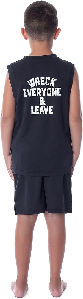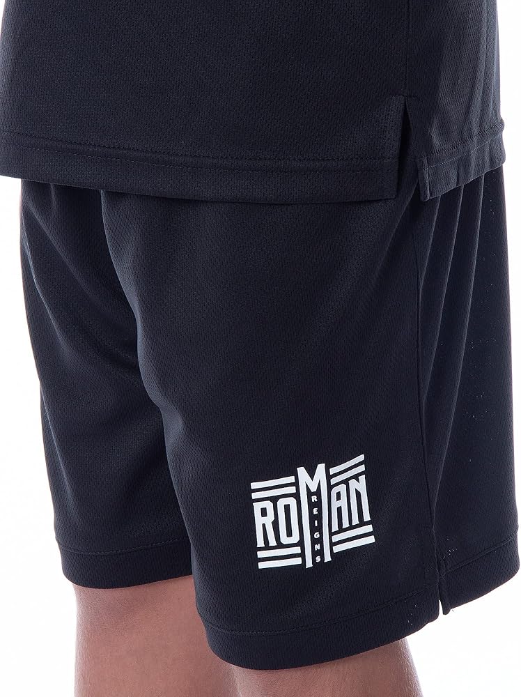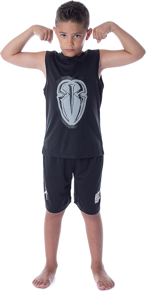 World Wrestling Entertainment, or WWE, is the premier professional wrestling promotion with over 450 live events every year, including WrestleMania, RAW, Royal Rumble, SummerSlam, and SmackDown. Its roster of wrestlers has gained international fame and has had storied wrestling and other entertainment venues like movies, music, and sports. The legends and current roster include Hulk Hogan, Andre The Giant, Vince McMahon, Roddy Piper, Stone Cold Steve Austin, The Rock Dwayne Johnson, The Undertaker, John Cena, Seth Rollins, Ultimate Warrior, Macho Man Randy Savage, AJ Styles, and Roman Reigns. The pajama set tank-top features Roman Reigns' classic symbol on the front, and then on the back, it contains the slogan "Wreck Everyone & Leave." The shorts have two small logos on either leg, one of the words "Roman Reigns," and the other is a white silhouette of the wrestler.