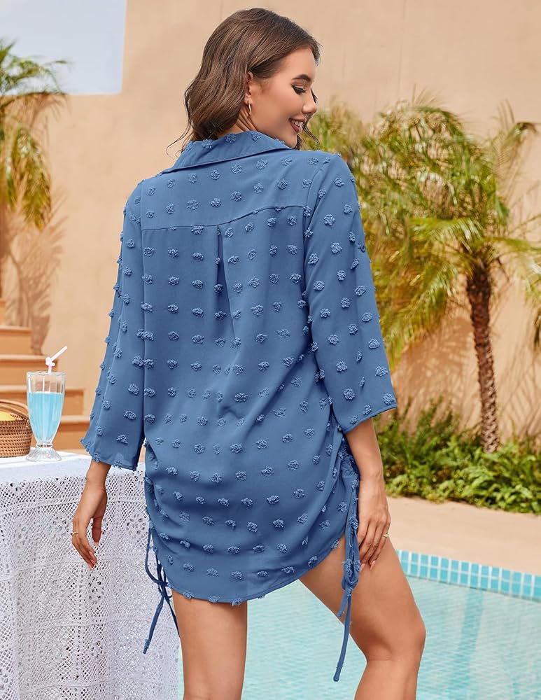 【المزايا: ياقة قميص، نقاط بولكا سويسرية أنيقة، 3/4 كم مع أساور بأزرار، رباط جانبي، جيب أمامي وفستان قميص بأزرار سفلية، تصميم فضفاض.