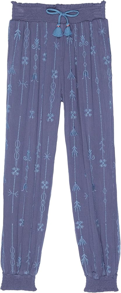 The Peek Embroidered Joggers are perfect to slay any casual look while enjoying optimal comfort. Elasticized waist with non-functional tassel embellished drawstring. Smocked detailing on the waist and the cuffs. Allover sleek embroidery. Pull-on construction. Shell: 100% rayon;Lining: 100% polyester. Machine wash, tumble dry.