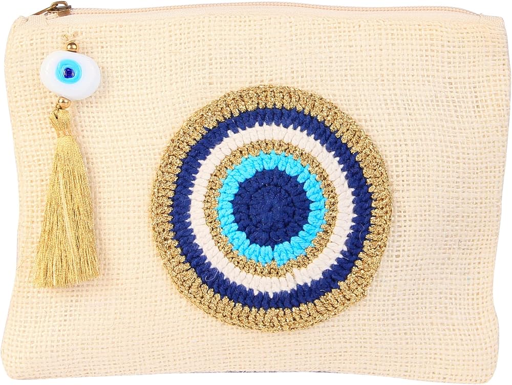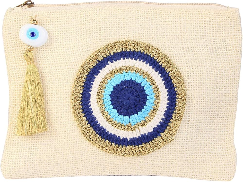 كارينزلاين هاند ميد شنطة يد صغيرة من قماش الجوت بتصميم عين الحسد، شنطة شاطئ بلون اوف وايت، شنطة هدايا بسحاب مع شرابة، لون اوف وايت، مقاس S