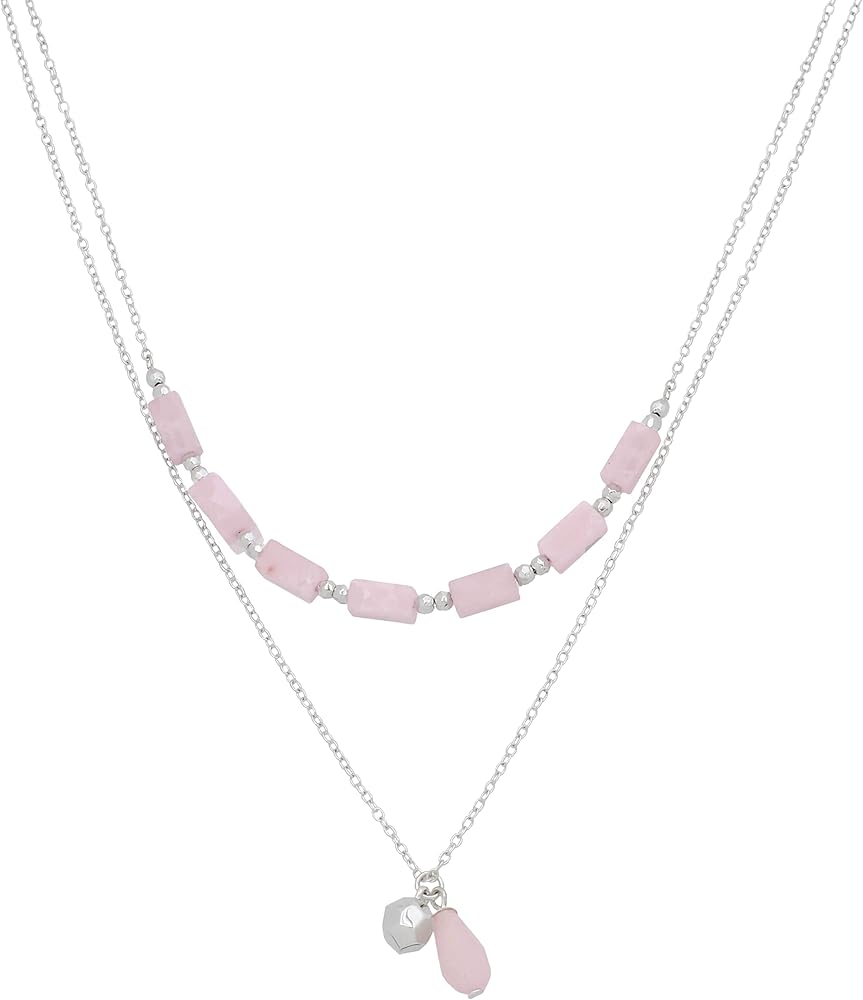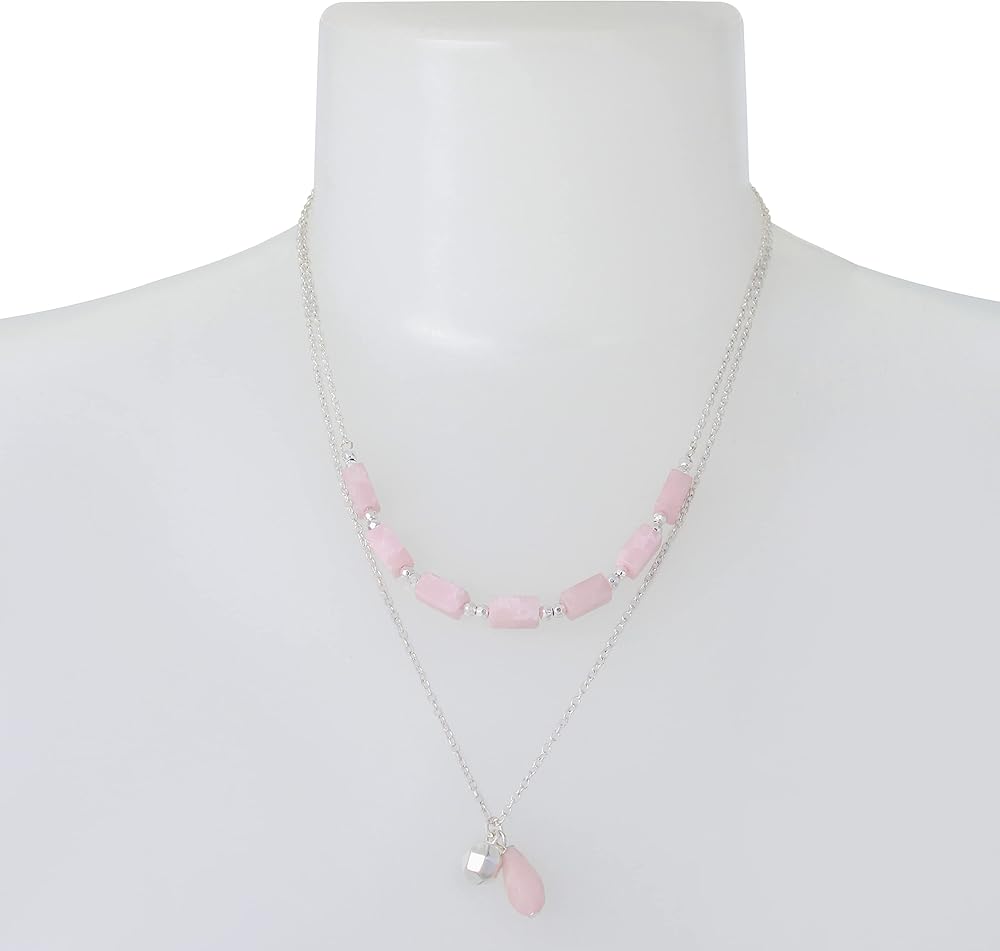 عقد سلسلة بطبقات مصقولة تتميز بخرز كوارتز وردي هندسي على خيط أقصر مقترن بأوجه متسقة وخرز فضي مطروق على خيط أطول.