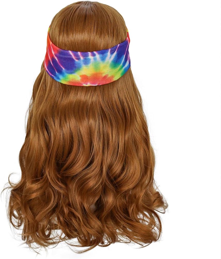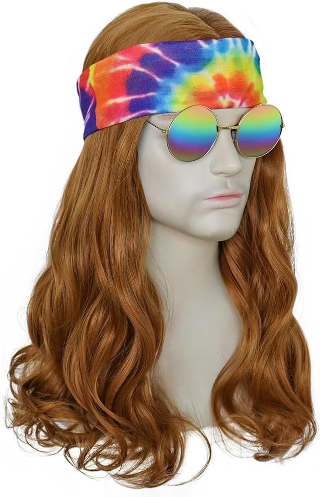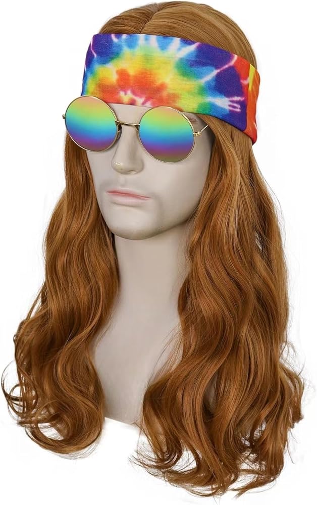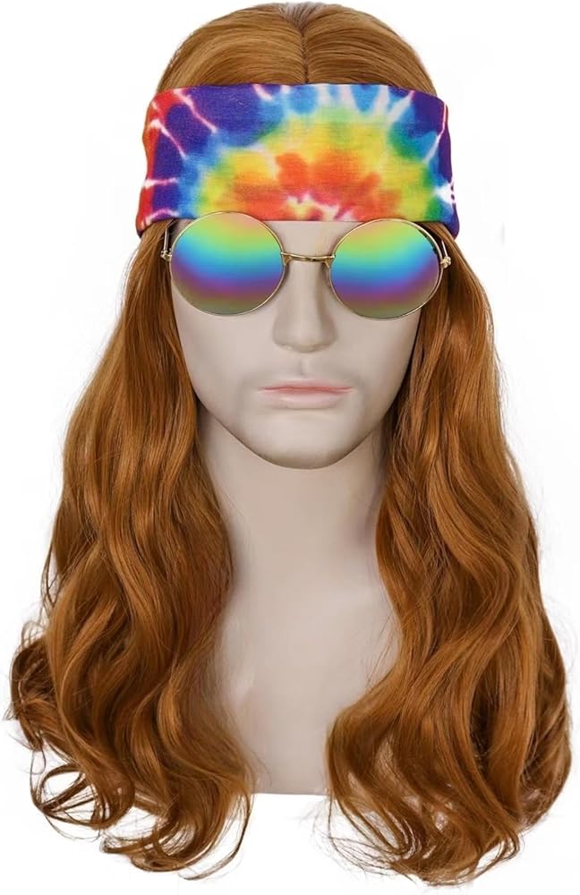 Description: JoneTing 5PCs Hippie Dark Brown Wig{+1 Glasses+1 Silver Necklace +1 Color Headband+1 Wig Cap} Costume with Tie Dye HeadBand 60s 70s Hippy Wig for Men Women Brown Wavy Wig Hippie Costume for Helloween Cosplay Party