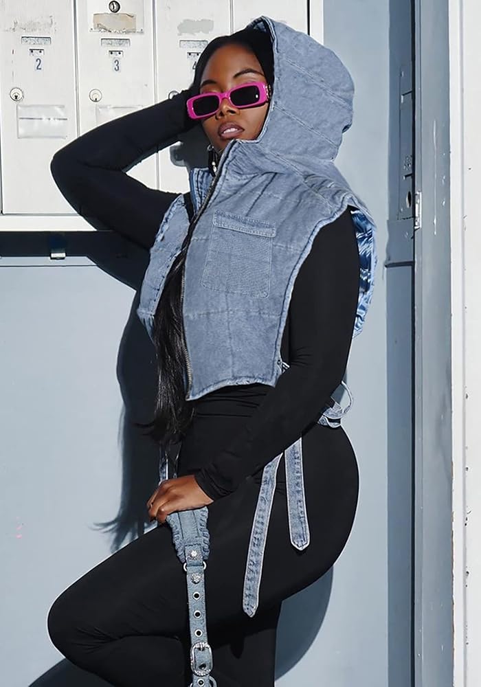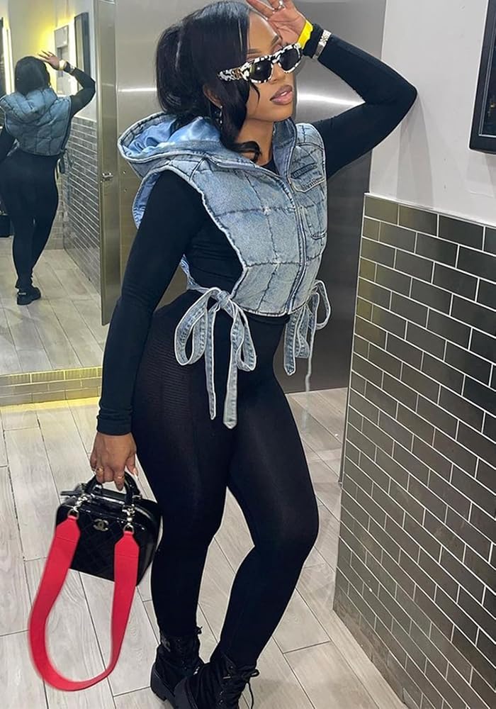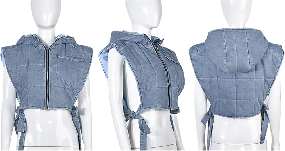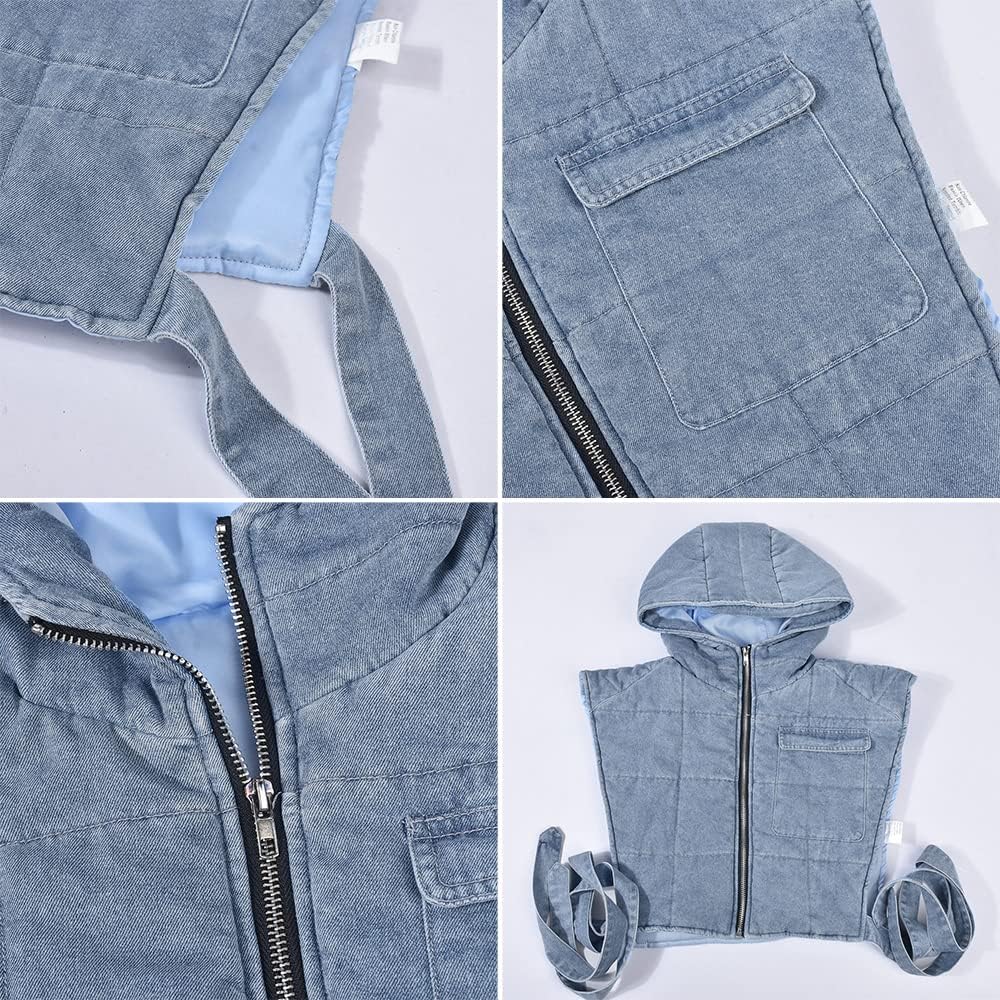 المواد: سترة نسائية كاجوال من الدنيم بدون أكمام مع غطاء للرأس مصنوعة من 75% بوليستر و25% قطن، ناعمة ومريحة وتناسب بشكل جيد.