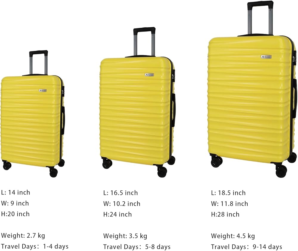 مجموعة من 3 قطع: توفر مجموعة الأمتعة المكونة من 3 قطع حقيبة أمتعة مقاس 20 بوصة، وحقيبة سفر مقاس 24 بوصة، وحقيبة كبيرة مقاس 28 بوصة. السعة: حقيبة مقاس 20 بوصة تلبي الحد المسموح به للحجم، وهي مناسبة للسفر على المدى القصير، وخفيفة الوزن وسهلة الحمل. تعد حقائب السفر مقاس 24 بوصة و28 بوصة مثالية لتسجيل الأمتعة، ومناسبة للسفر طويل الأمد والسفر العائلي.