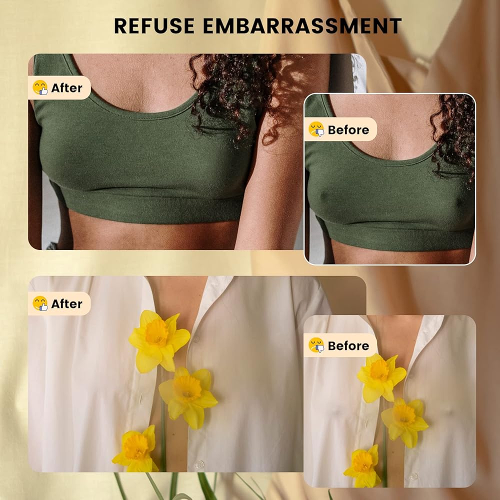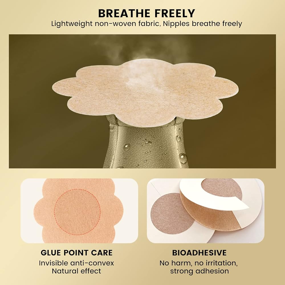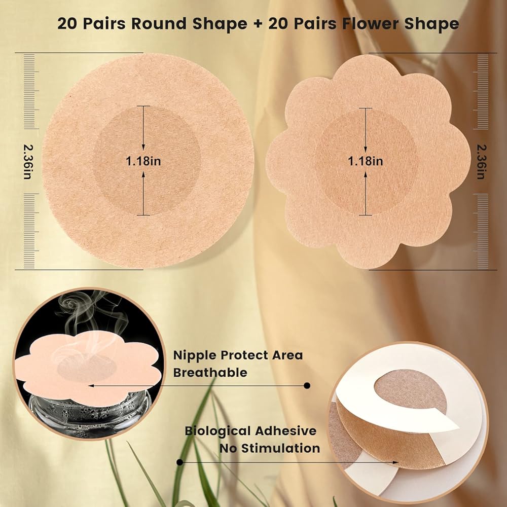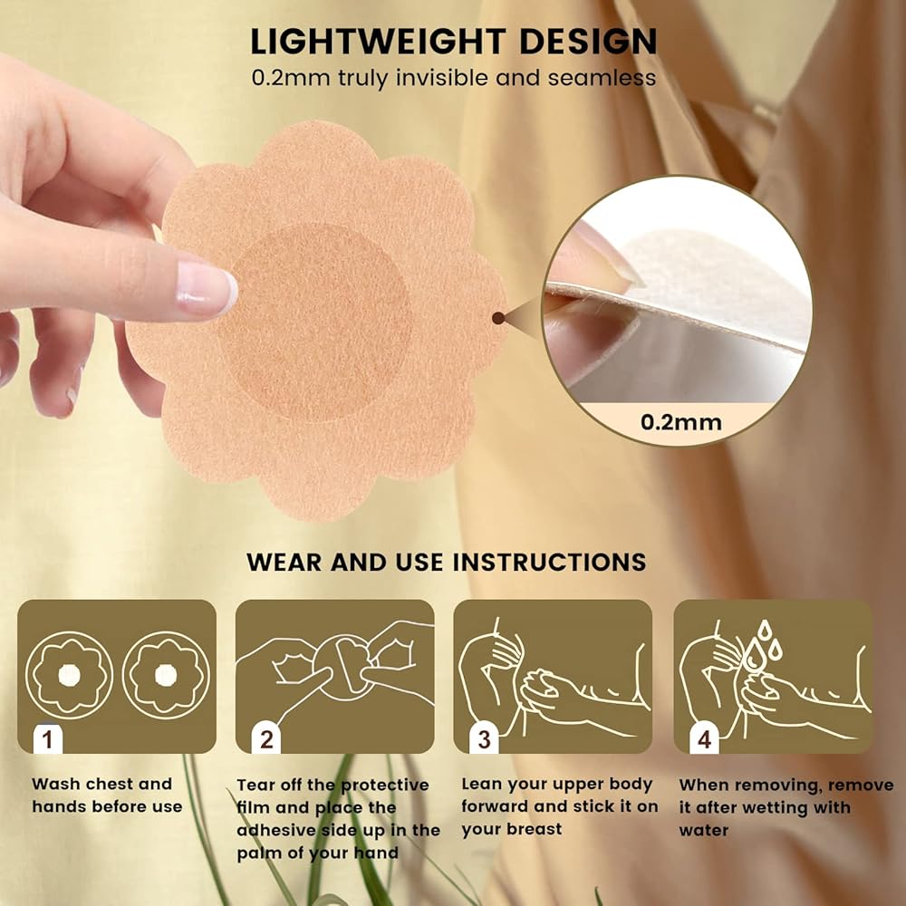 🎀【أغطية حلمات ذاتية اللصق】- تتميز رقع الثدي هذه بتصميم ذاتي اللصق، وتزيل الطبقة الواقية، وتميل الجزء العلوي من جسمك إلى الأمام وتلصقها على حلمتك، وتضغط على الحلمة لضمان الالتصاق المناسب. تصميم مركزي ناعم غير لاصق يحمي منطقتك الحساسة. رائعة عندما لا ترتدي حمالة صدر. عند الإزالة، بللي فطائر اللحم بالماء، ثم قومي بتمزيقها ببطء ورفق.
