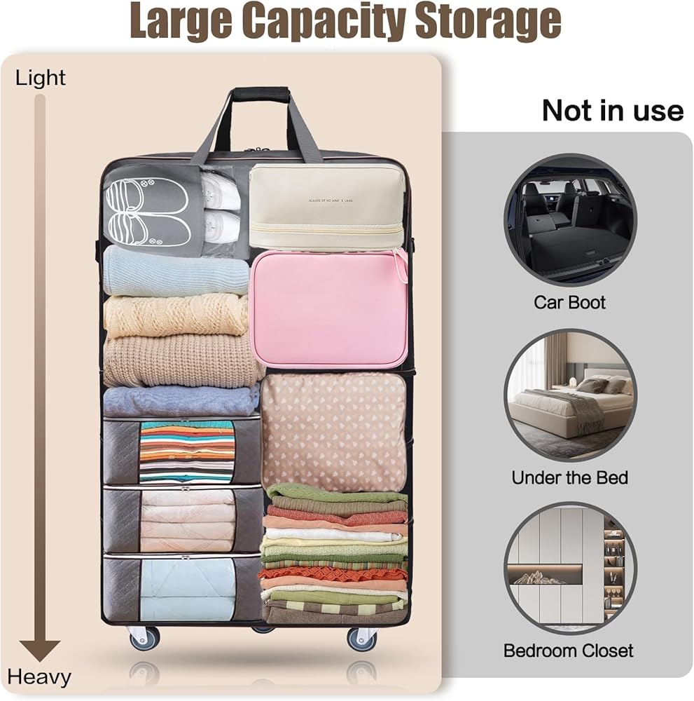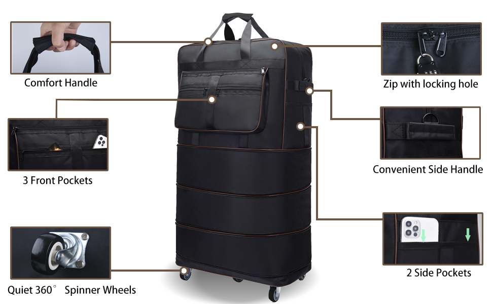【الخامة: هذه الحقيبة القابلة للطي ذات العجلات مصنوعة من قماش أكسفورد متين ومقاوم للخدش ومقاوم للماء مع بطانة مقاومة للماء. حزام خلفي قابل للتعديل عالي الكثافة. سحاب معدني عالي الجودة في اتجاهين، قوي ومتين. توجد 5 عجلات عالمية صامتة في الأسفل، ثابتة ومرنة.