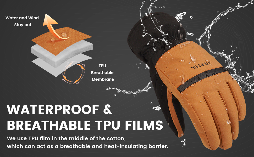 دافئة ومقاومة للماء: قفازات التزلج من Atercel محشوة بـ 240 جرام من القطن الدافئ والمنتفخ، والسطح مغطى بطبقة مقاومة للماء. يوفر غشاء TPU المقاوم للماء حماية كاملة. مادة مزدوجة الطبقات مقاومة للماء يمكن أن تبقي يديك جافة أثناء ممارسة الرياضة واللعب بالثلج، ولكن لا تغمر قفازاتك في الماء. الأصفاد المرنة تمنع دخول الثلج والرياح إلى داخل القفازات. يمكن لهذه القفازات أن تحميك من البرد والثلج من العالم الخارجي.