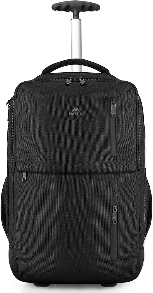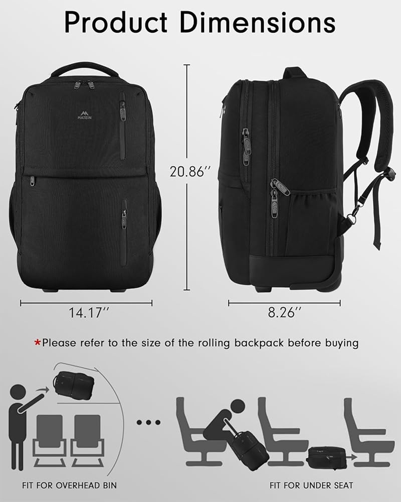 ماتين شنطة ظهر بعجلات مقاس 17 انش، شنطة ظهر للاب توب للسفر بعجلات مقاومة للماء مع عجلات كبيرة لحمل الامتعة، شنطة ظهر بعجلات للاستخدام الليلي والاعمال والكلية، لون اسود