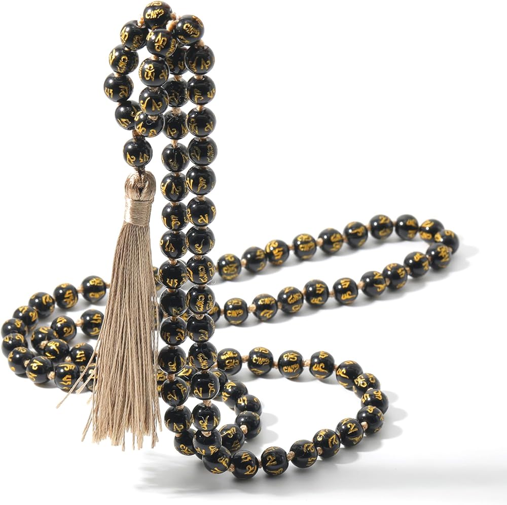 محيط قلادة مالا: 110 سم (43 انش) طول الشرابة: 8 سم، الحبل مزدوج الخيط. 100% مصنوع يدويًا بين كل خرزة. سوار من خرز مالا مكون من 108 خرزة يمكنك استخدامه كسوار ملفوف أو قلادة!
