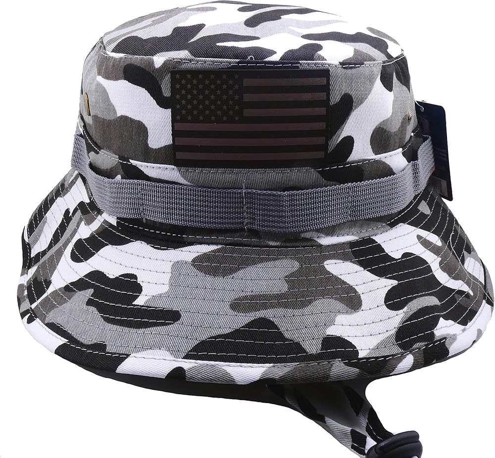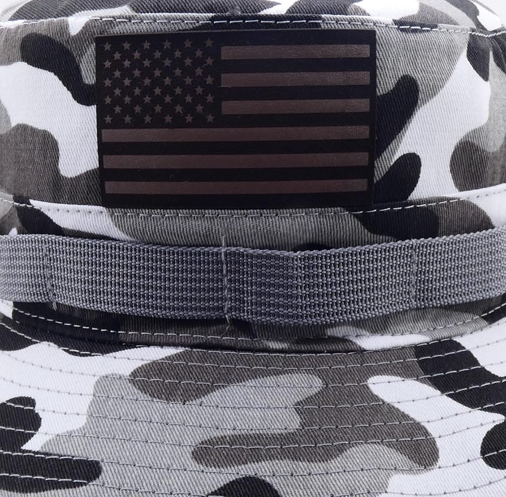 Camo and Solid Color Boonie Fishing Hat with Genuine Leather America Flag with Draw cord closure. Leather Flag patch is made in the USA.