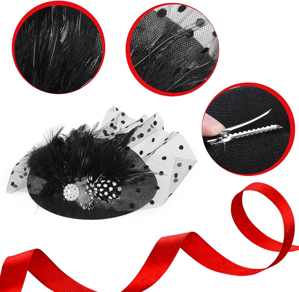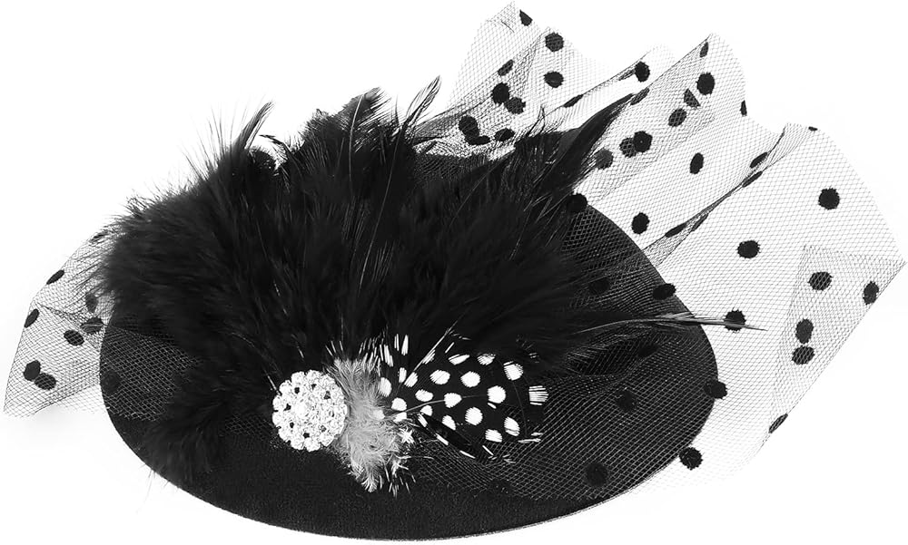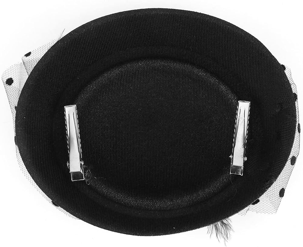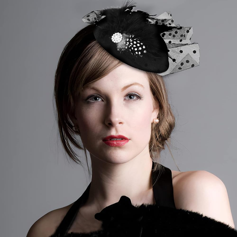 Yolev الأسود قطع زينة للنساء قبعات مستديرة 20s 50s قبعة مع ريشة شبكة الحجاب كوكتيل الشاي أغطية الرأس للفتيات والنساء