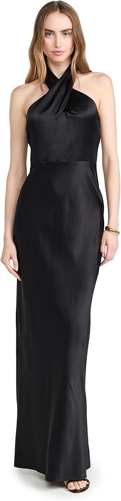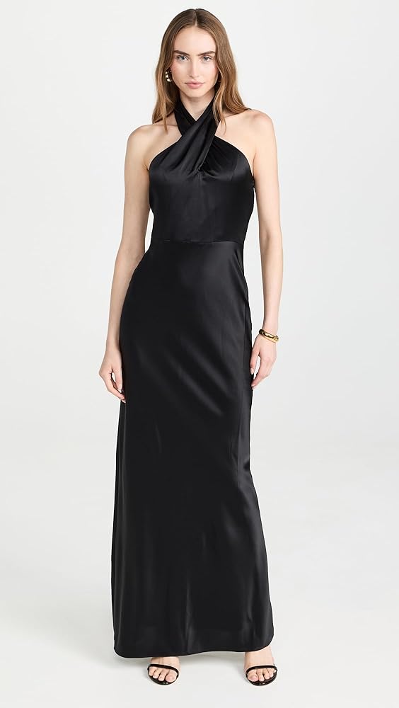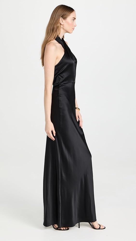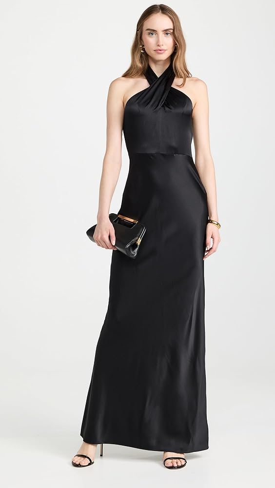 A special-occasion piece with timeless sophistication, this Veronica Beard dress is cut from lustrous stretch black silk and designed with a broad halter neckline. Accompany yours with tonal shoes and a tonal mini bag.