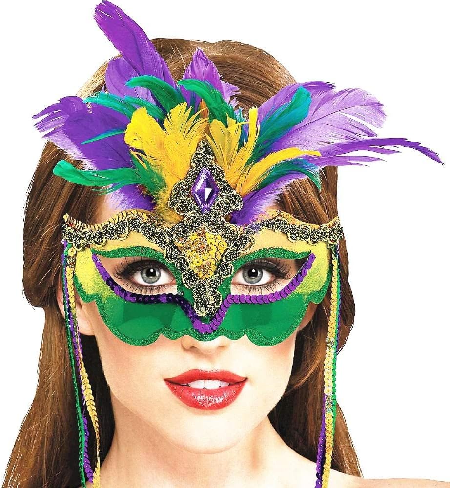 Carnival feather mask ideal for Mardi Gras Party Favors,The venetian mask with feathers can also be used with mardi gras beads to glam up special Mardi Gras party costumes.