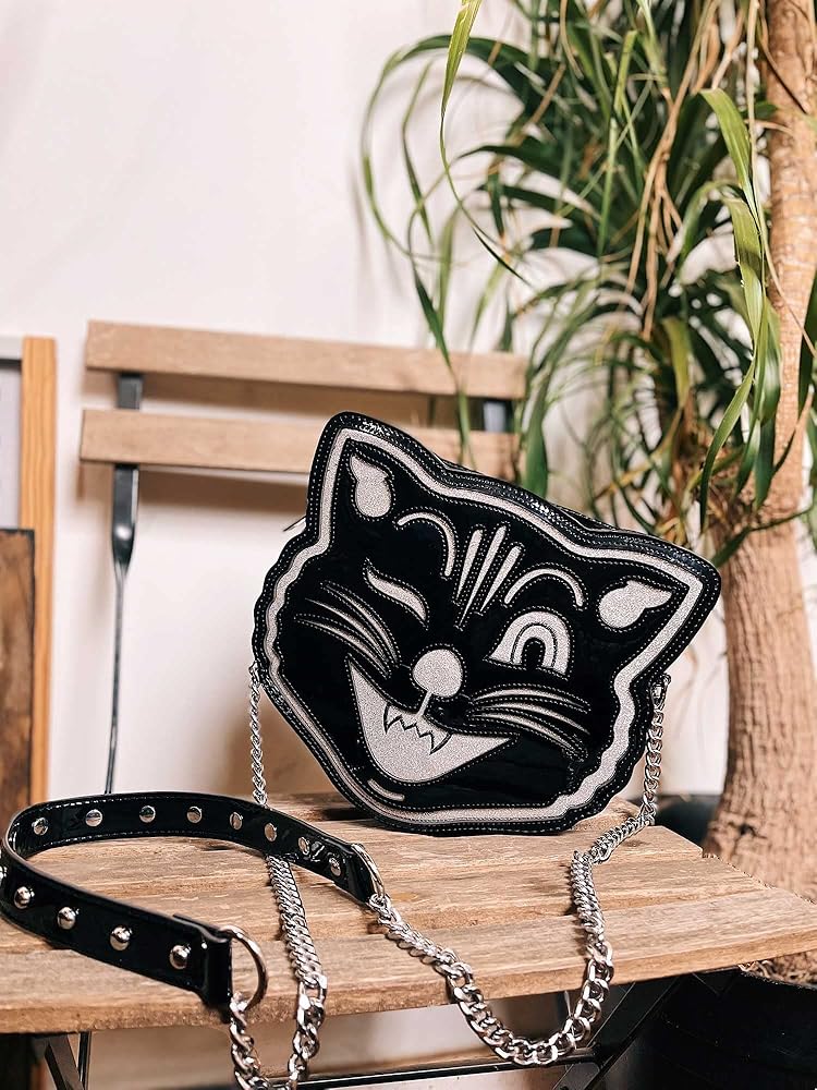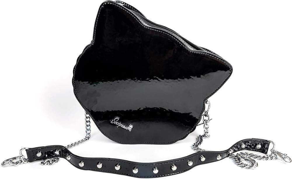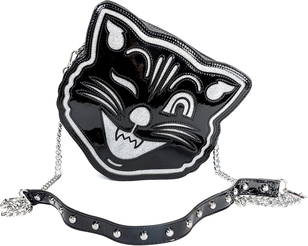 • Our favorite mascot, Jinx the Cat, is now a fun shaped crossbody bag! Made of high quality glossy vinyl with silver glitter vinyl accents, this is a black cat lovers must have! It unzips at the top and the lined interior has a pocket to keep your must haves within easy reach. The long chain crossbody strap is actually two straps in one! Leave it as is, or make it a shoulder bag with just the middle studded section that can be used as a shoulder strap.