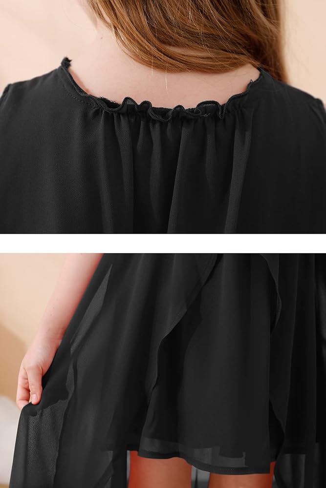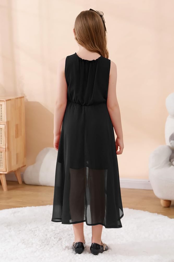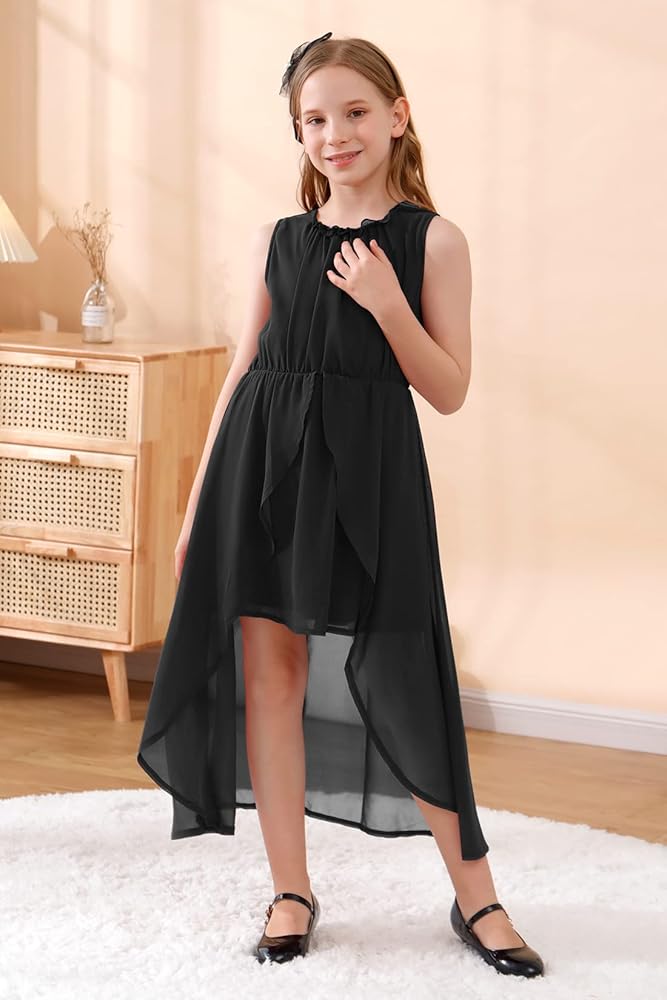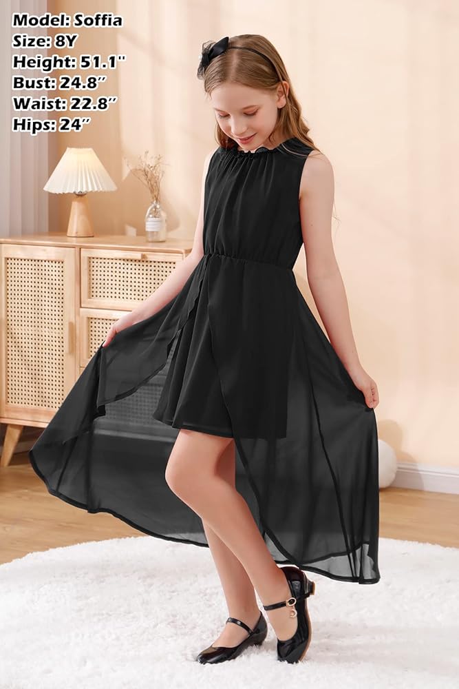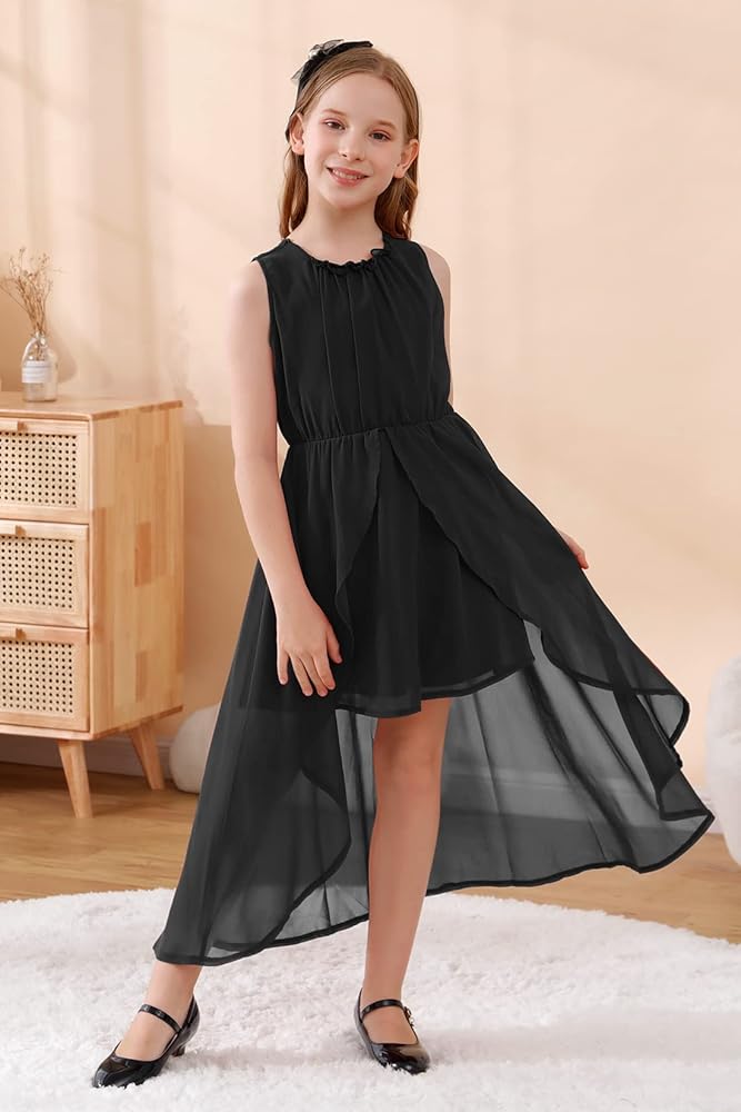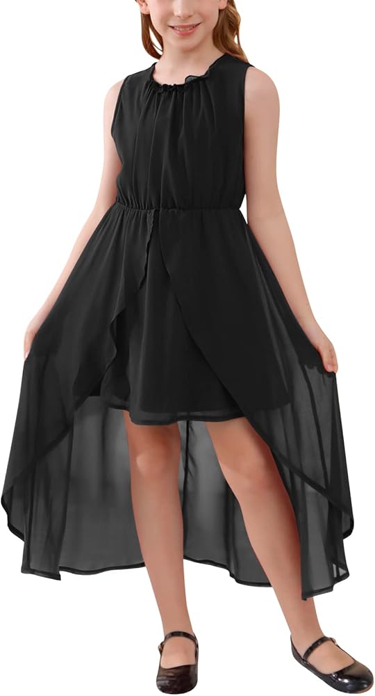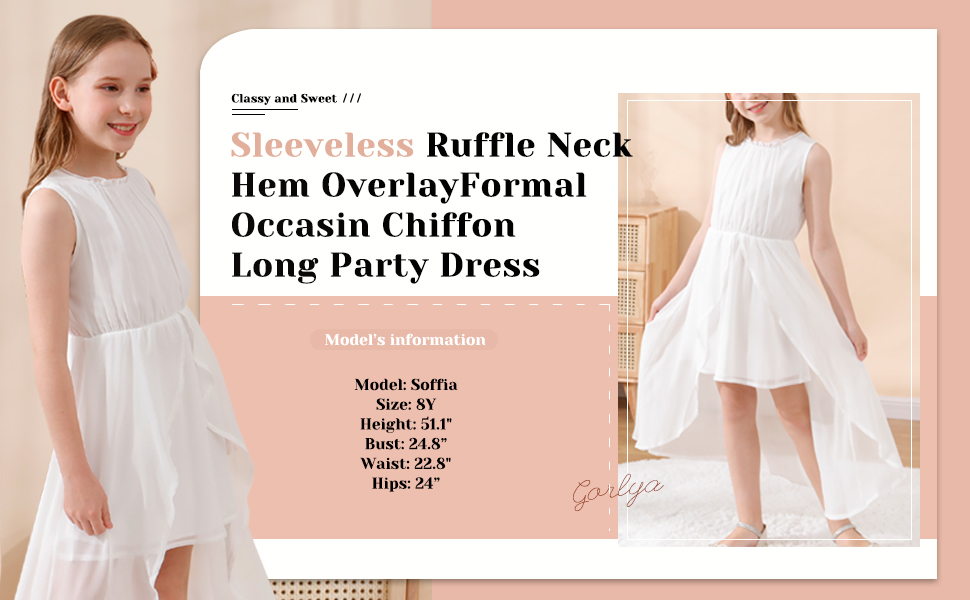 فستان حفلات طويل من GORLYA للفتيات بدون أكمام ورقبة مكشكشة وحاشية عالية وطبقة رسمية من الشيفون 4-14T