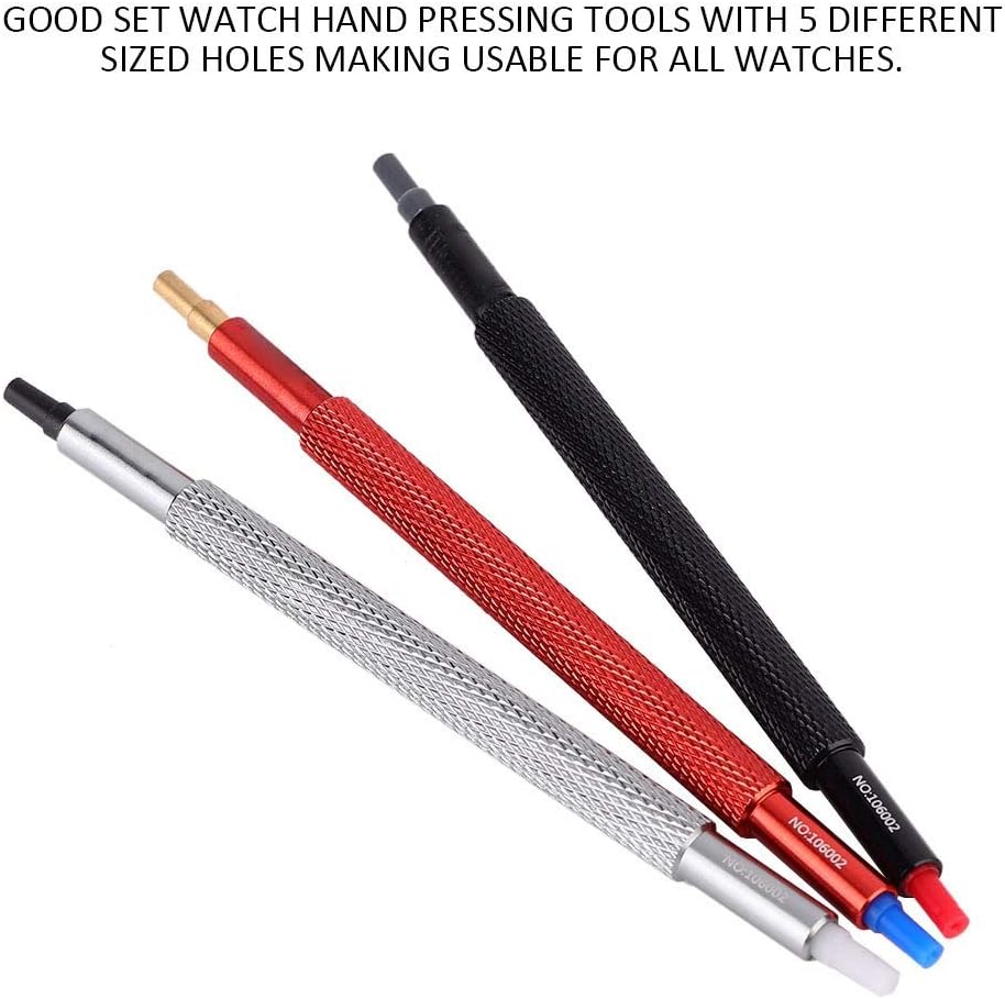 مجموعة جيدة من 3 أدوات ضغط يدوية مع 5 فتحات مختلفة الأحجام مما يجعلها قابلة للاستخدام لجميع الساعات. تُستخدم عند تركيب عقارب الساعة للمشاهدة. يمكنك اختيار مقاس أكبر قليلاً من الفتحة الموجودة في اليد، وهذا يعني أنه يمكنك الضغط على اليد دون ضرب أجزاء الساعة الفعلية مما يمنحك تحكمًا رائعًا للضغط باليد بأمان. مصنوع من الستانلس ستيل، قوي ومتين. اضبط عقارب الساعة دون خدش المينا.