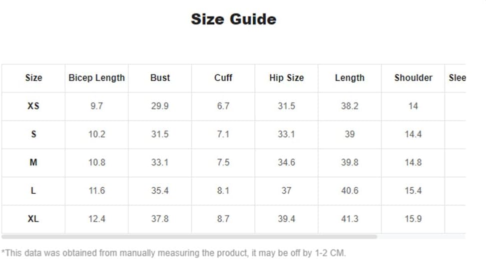 - مقاس الصدر: (X-Small) 29.9 بوصة؛ (صغير) 31.5 بوصة؛ (متوسط) 33.1 بوصة؛ (كبير) 35.4 بوصة؛