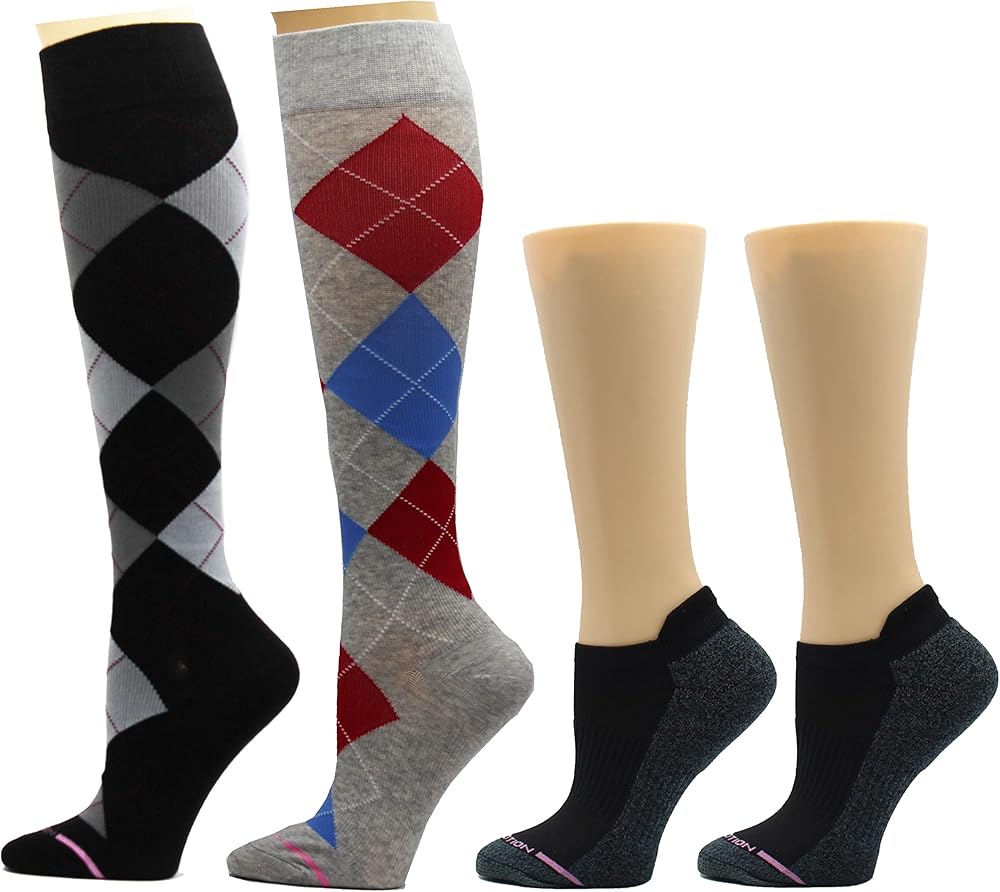 Dr. Motion's everyday 4 pair combo pack compression socks are designed to provide style and function. Our socks offer enhanced support for maximum, all-day comfort that will keep up with your every day activities. Trudry yarn wicks away moisture to keep feet dry. Other features include breathable mesh, seamless toe, arch support and a achilleic protection tab.