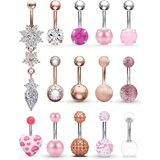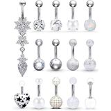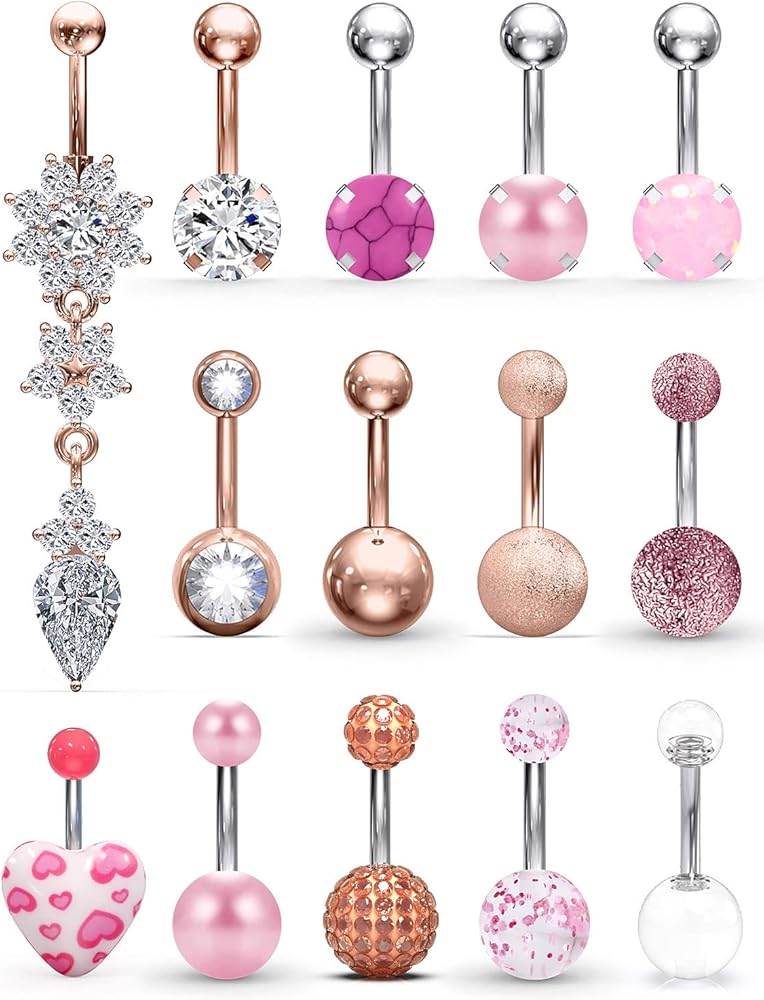 Including 14PCS Belly Button Rings, Mix-Styles(Clear CZ Dangle Belly Rings,Jeweled CZ,Shinny Balls,Matte Ball,Clear Acrylic Balls,Gilitter Balls,Gems Balls,Prong-Setting Opal,Prong-Setting Pearl,Prong-Setting Natural Stone,Prong-Setting Clear CZ,Heart,Pearl Balls,Acrylic Matte Balls,Each Style One Piece). Reasonable Price For Body Jewelry,Deserve To Purchase.