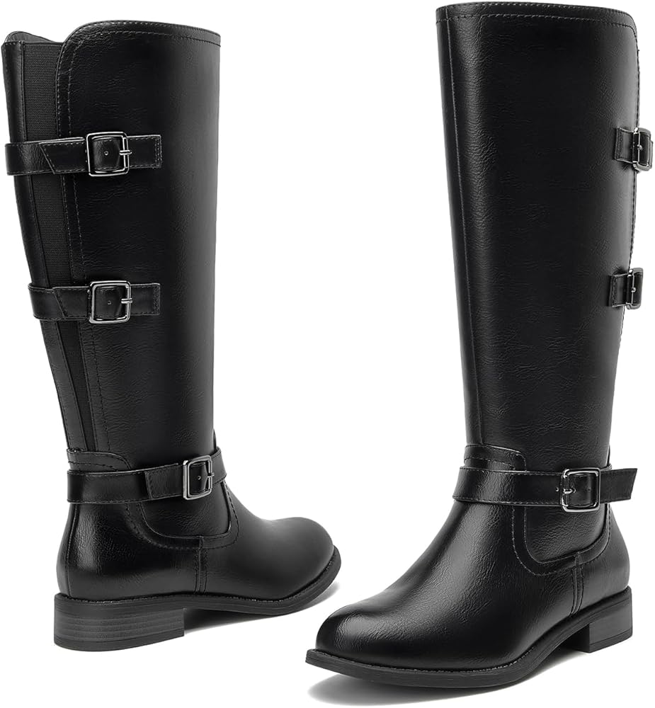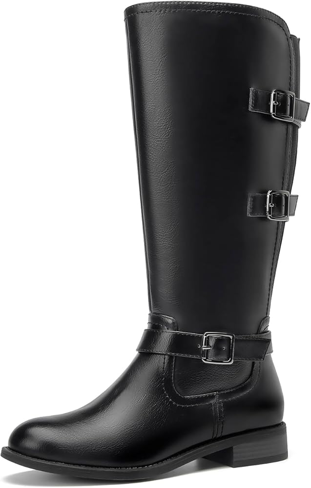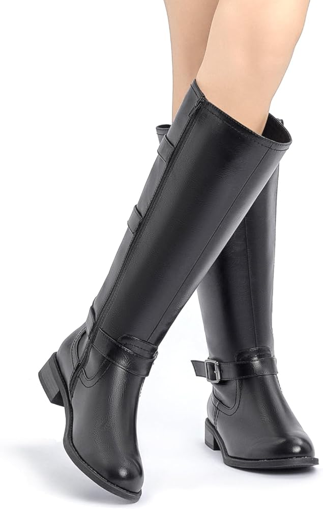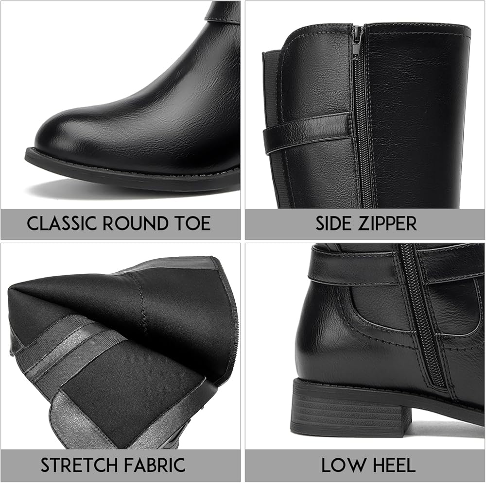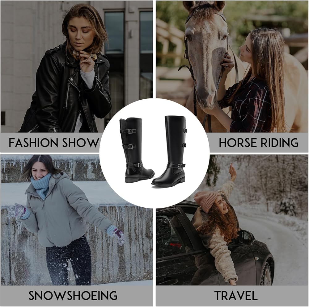 للنساء حذاء برقبة للركبة بكعب منخفض وحزام بثلاثة إبزيم بمقدمة دائرية أحذية ركوب الخيل قابلة للبسط أحذية شتوية عصرية