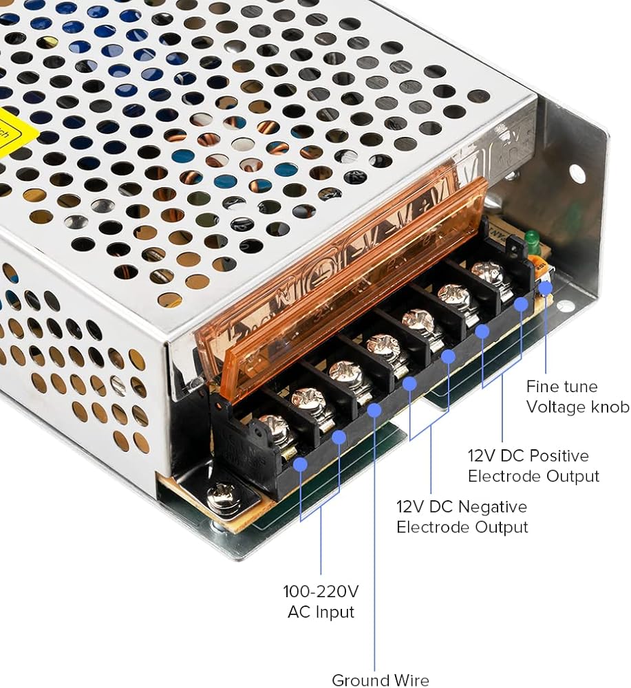 الإدخال: 110 فولت - 220 فولت 50/60 هرتز؛ الإخراج: 12 فولت تيار مستمر حتى 16.5 أمبير كحد أقصى؛ يمكن تنظيم جهد الخرج بنسبة ±10%، من 11.5 فولت إلى 12.5 فولت، يعمل مع الجهاز الذي يسحب أقل من 16.5 امبير، مثل DC12V1A ~ 16.5A.