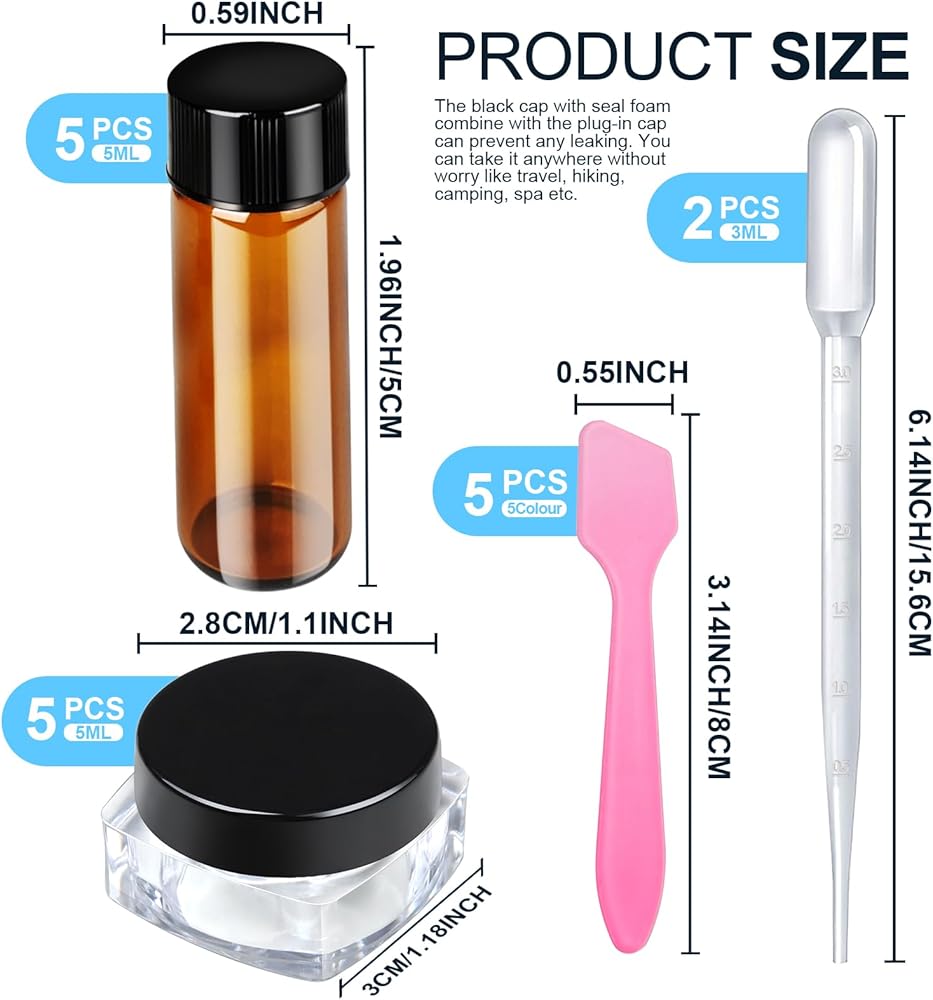 Sample containers set: package included 5pcs 5gram plastic sample containers, 5pcs essential oil bottles 5ml, 5pcs mini spatulas, 2pcs plastic droppers 3ml. These cosmetic containers can meet your needs for both liquids and solids, perfect for traveling and carrying around