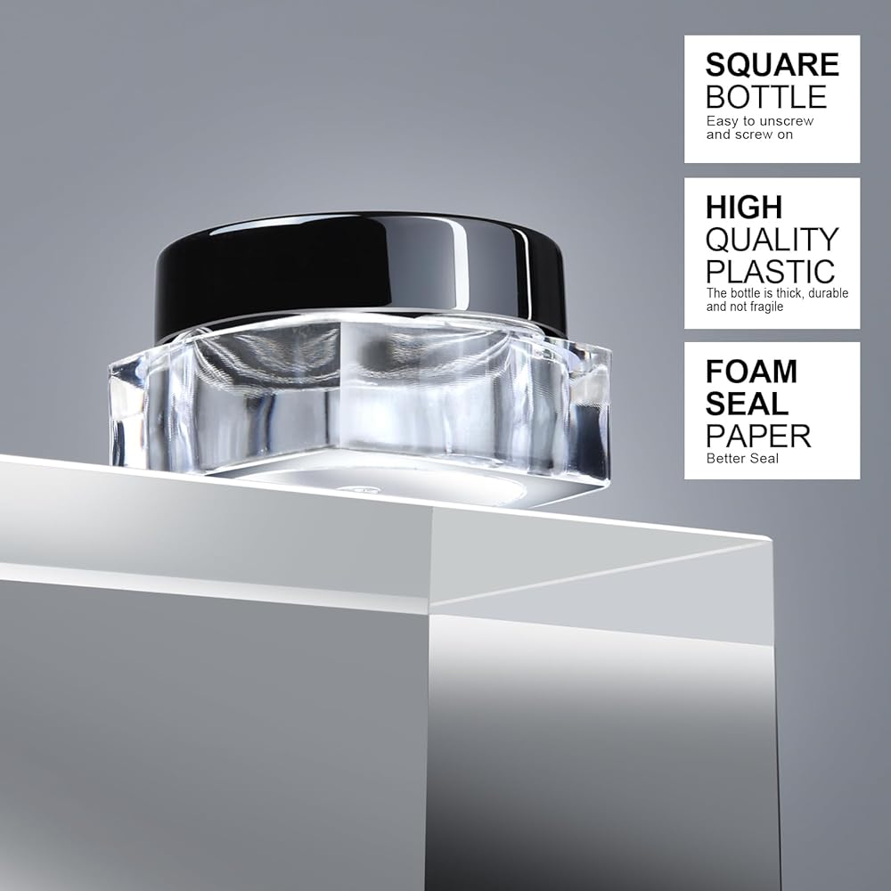 High quality plastic cosmetic containers: plastic cosmetic containers are made of high quality PP. Can accommodate general cosmetics without chemical reaction. Thick smooth bottle body , heat-resistant and not fragile, a tight seal and can be reused. The square shape makes it easier to open.