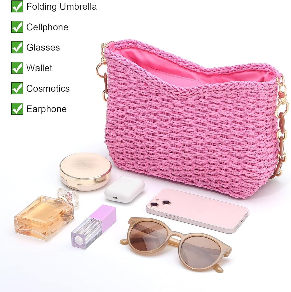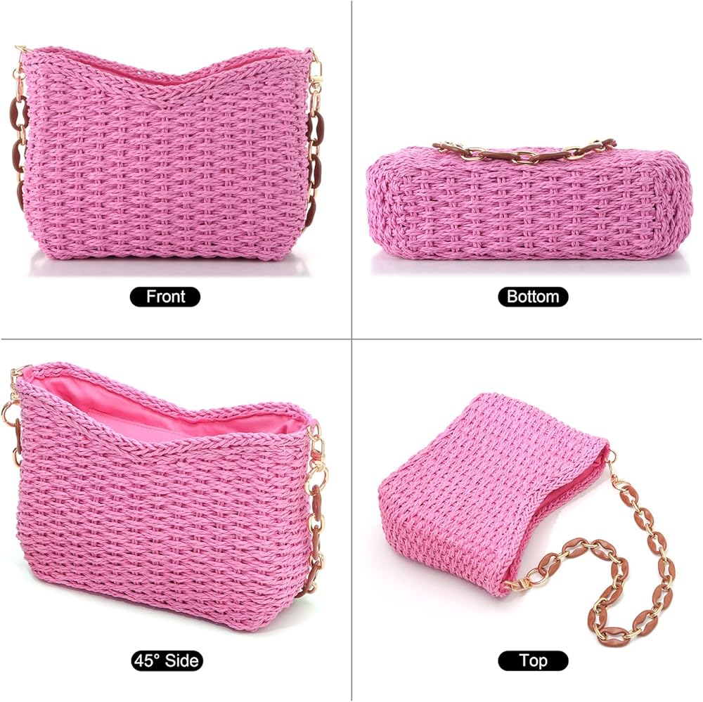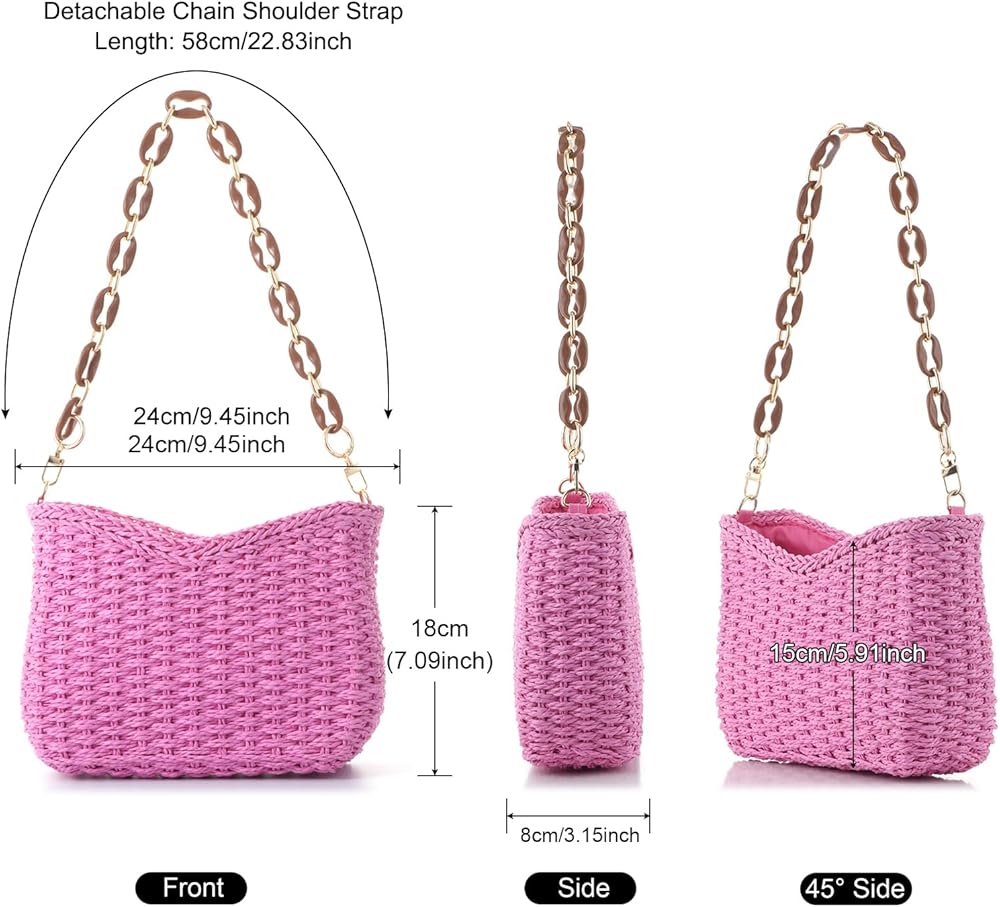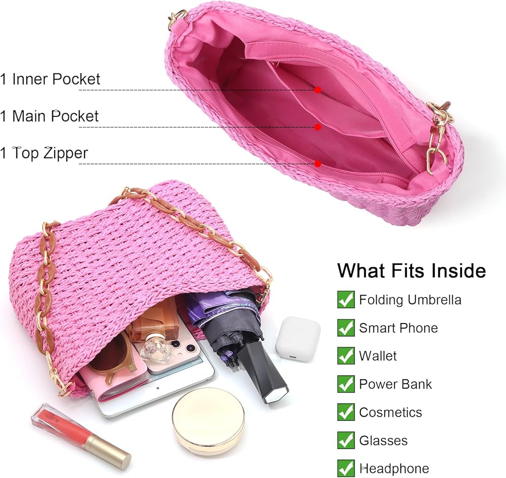 SIZE: The beach straw shoulder bag measures approx 9.45*3.15*7.09''(L*W*H), chain shoulder strap length: 22.83''. Zipper closure makes it easy to access, can hold your phone, wallet, keys, sunglasses, lipstick, sunscreen and folding umbrella, etc