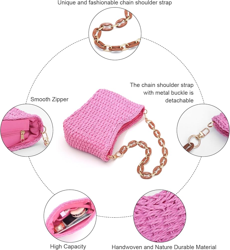 VERSATILE DESIGN: This straw beach bag features a removable chain strap, allowing you to wear it as a shoulder bag or carry it as a clutch, making it perfect for any occasion, giving you maximum versatility and convenience