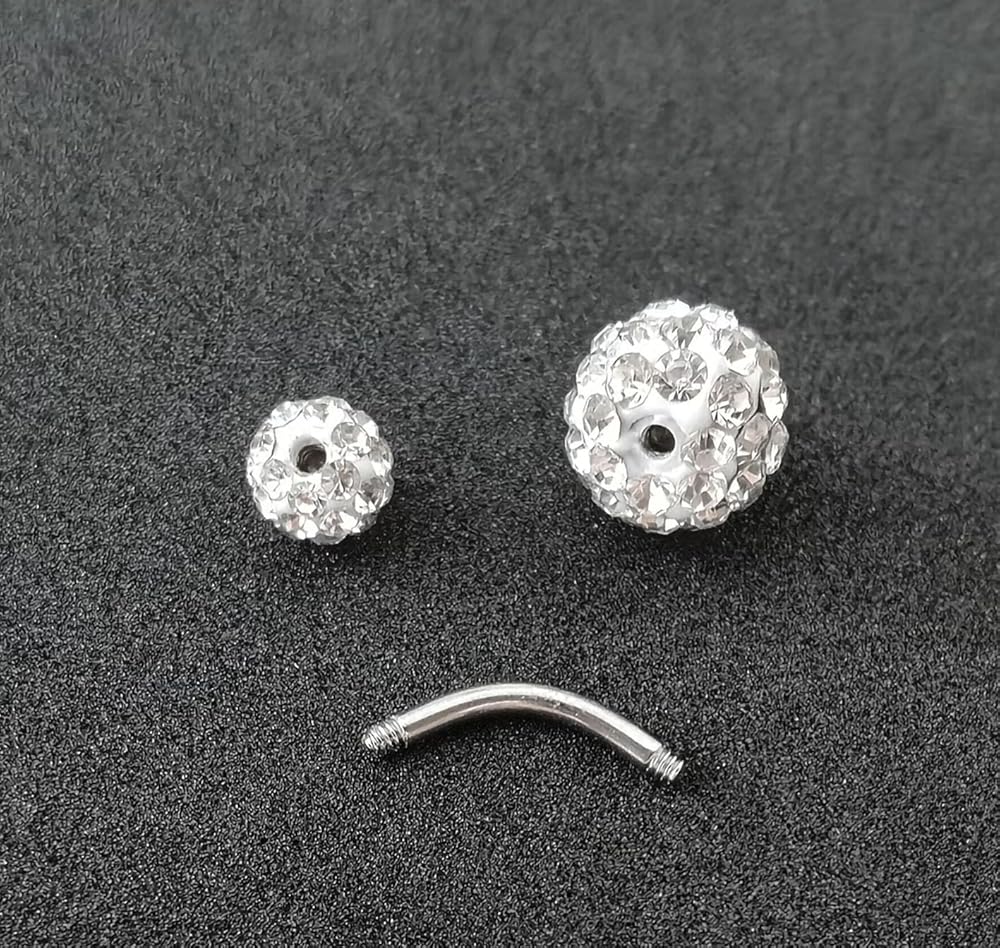 - Size: Small ball:5mm, bigger ball: 8mm, bar length: 10mm, thickness: 1.6mm(14G).