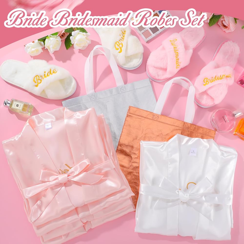 أساسيات حفلات توديع العزوبية: هناك 15 مجموعة من وصيفات العروس، بما في ذلك زوج واحد من شباشب الزفاف، وأربعة أزواج من شباشب وصيفة العروس، ورداء زفاف، وأربعة أردية لوصيفات العروس، وحقيبة يد واحدة للعروس، وأربعة حقائب يد لوصيفات العروس. تلبي جميع احتياجات حفلتك في وقت واحد، مما يوفر لك الوقت والمال والقلق.