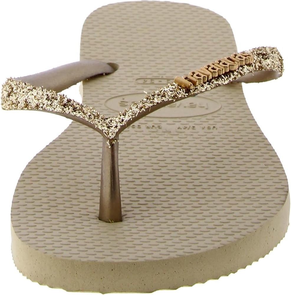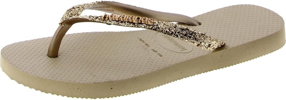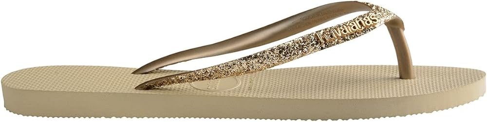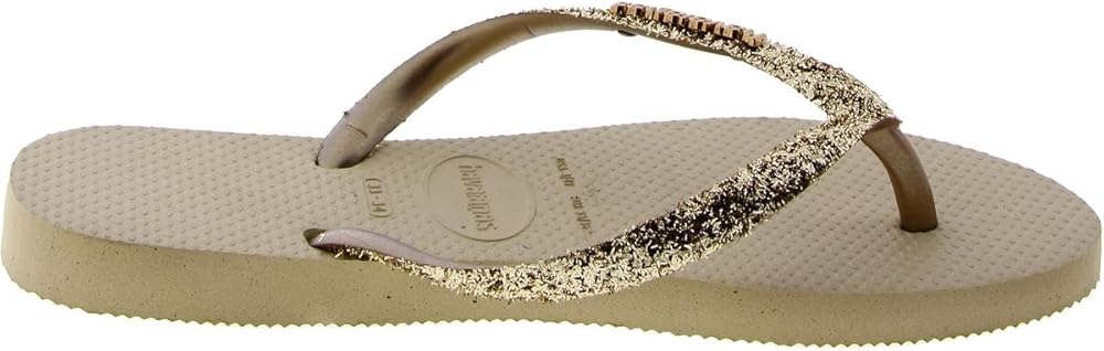 Let your feet steal the limelight wearing the Havaianas Kids Slim Glitter II slippers, featuring a heat-resistant, non-slip, and water-resistant design. Synthetic upper, lining, and insole. Thong-style glitter straps. Lightweight, heat-resistant, non-slip, and water-resistant. Tonal metallic logo on the glitter strap. Toe-post closure. Slip-on style. Rubber outsole. Measurements:Single shoe weight: 2 oz.