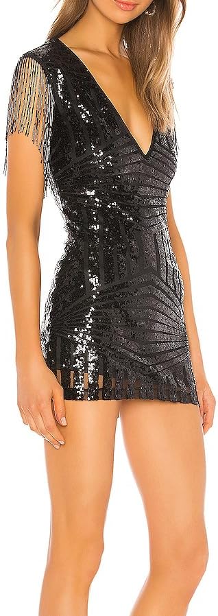 المزايا: فستان نسائي قصير بشراشيب، مزين بالترتر بالكامل، سحاب جانبي مخفي، تصميم بدون أكمام وشرابات، مقاس ضيق، يظهر عظمة الترقوة الجميلة.