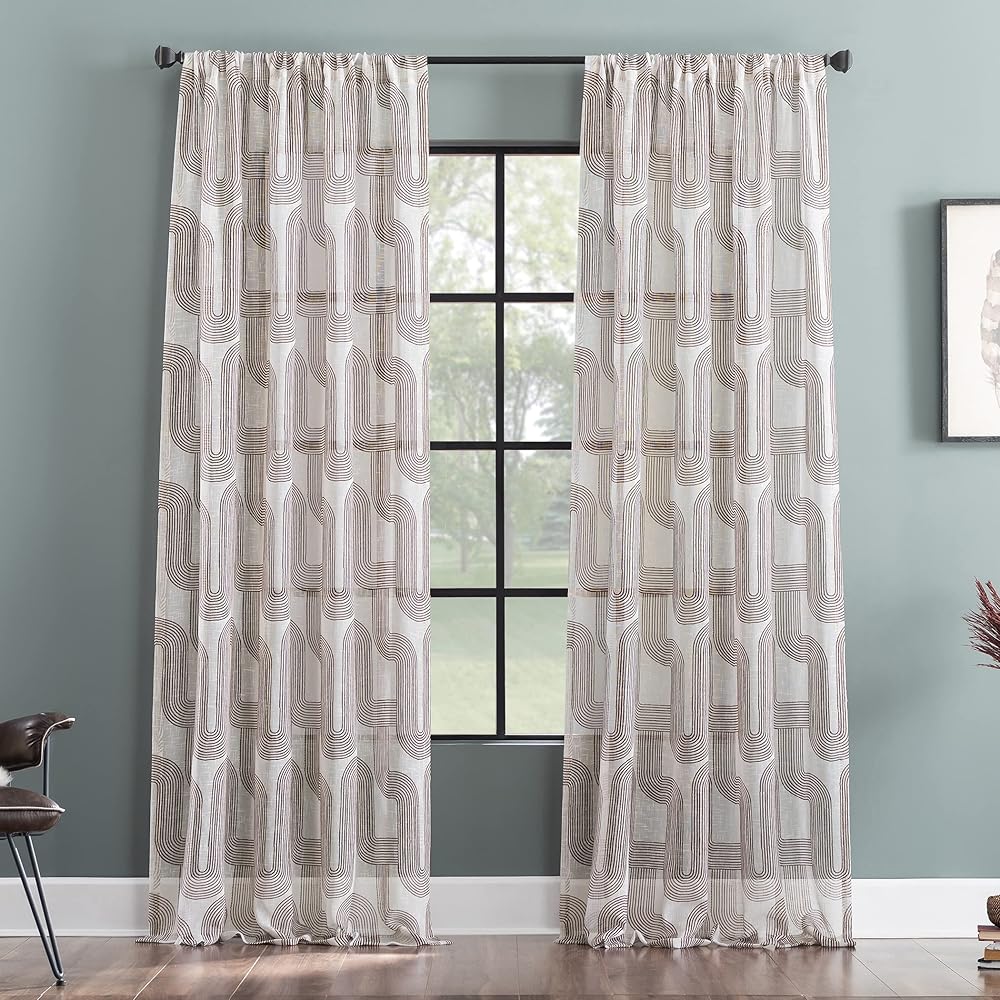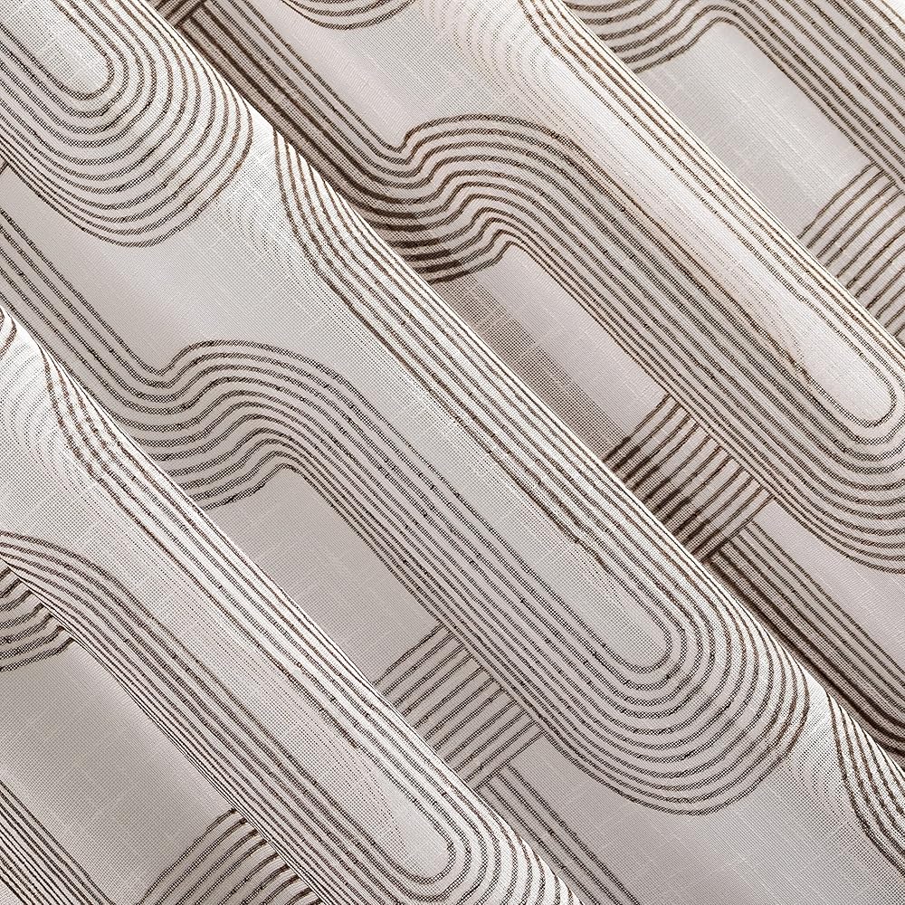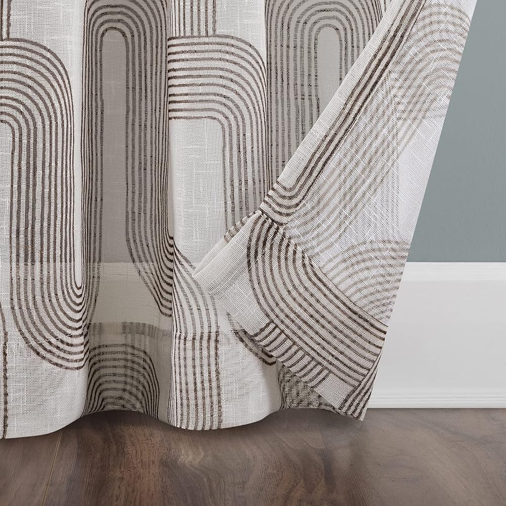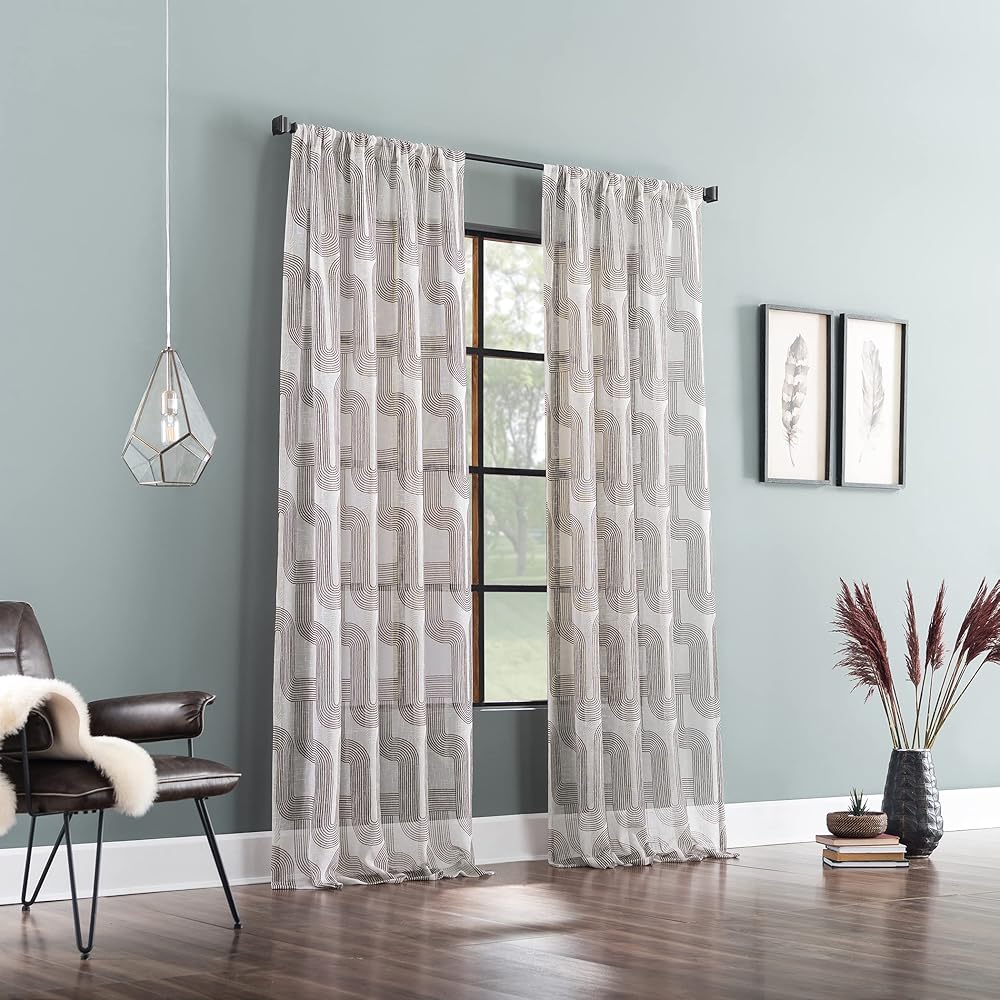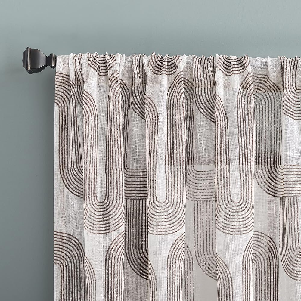 Bring retro chic to any space with the art deco inspired printed curves of Rod Pocket Curtain from Archaeo. The linen blend sheer fabric gently captures light while adding privacy. Rod pocket designed for curtain rods up to 1 ½" in diameter. Sold as individual panels measuring 50" width by 84" length in color pecan brown. Measure carefully before selecting your desired size and quantity. Rod not included. Machine wash cold on gentle cycle. Use non-chlorine bleach when needed. Tumble dry on low heat.