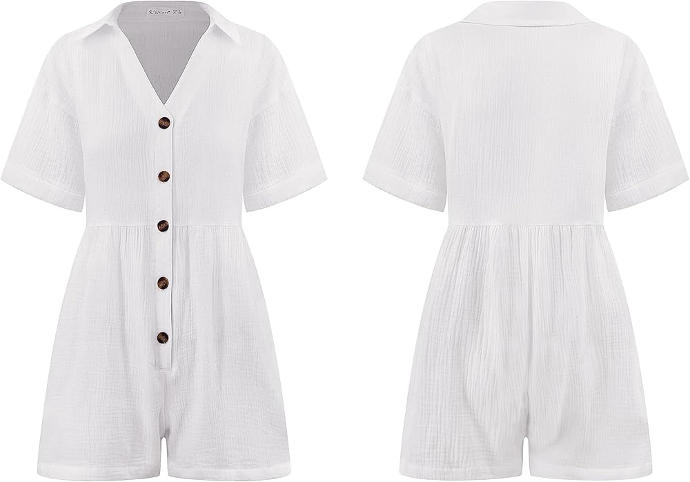 FEATURES: Women's Short Jumpsuits for All Seasons, Not Just Summer or Fall. Cotton Fabric, Casual Style, Loose Fit, Short Sleeve, Collared, V Neckline, Button-Down Closure, Textured Ripple Pattern Fabric, Ruched Details at Waist, Solid Color, Two SIde Pockets.