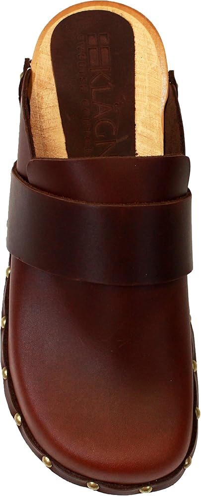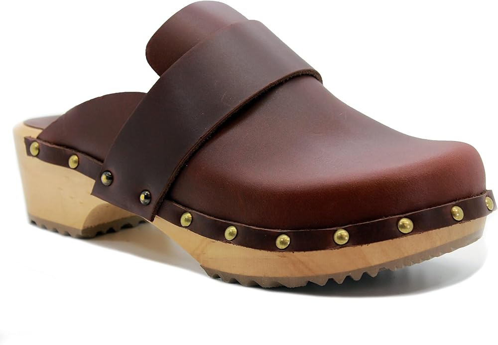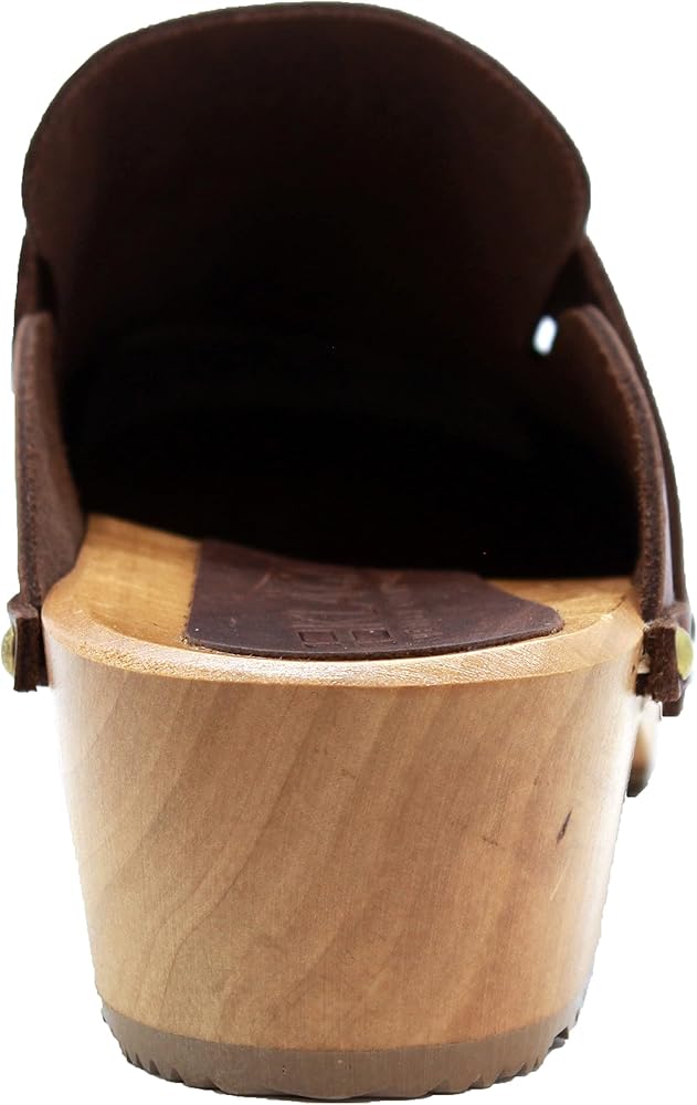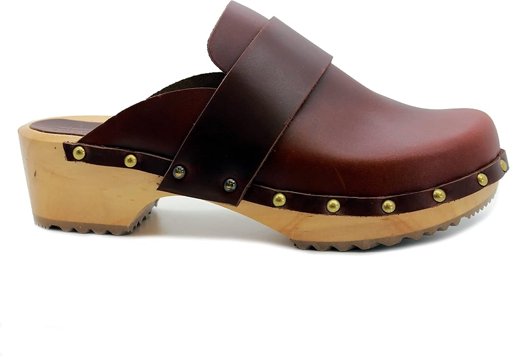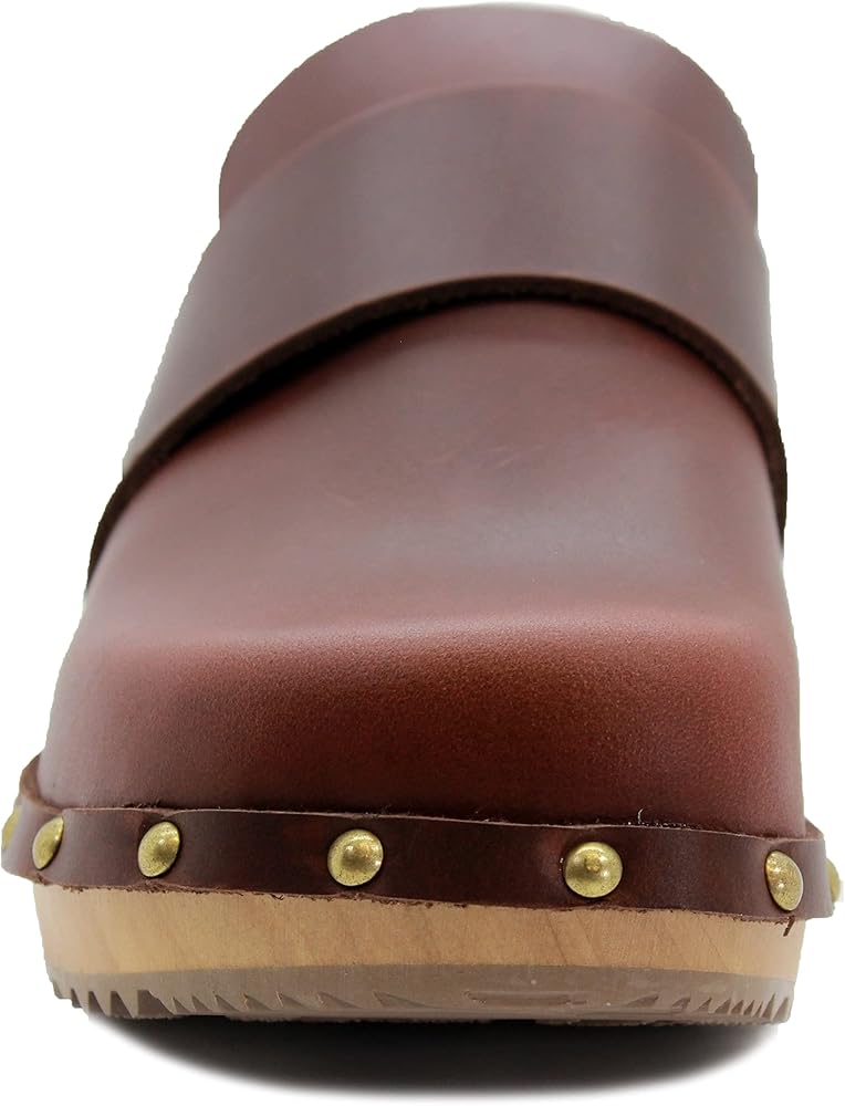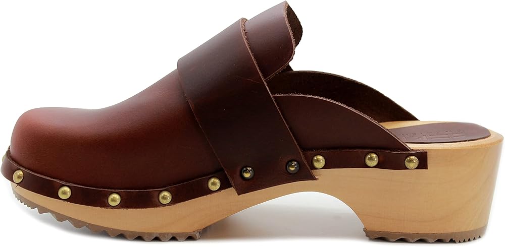The Helvi is a fashion infused classic Swedish clog. Full Grain leather upper and classic wood outsole make this clog a Swedish original classic. Featuring brass colored nail studs with a genuine wood outsole harvested from sustainable European forests. Always hand-made in Europe by true artisans that have been making clogs for over half a century.