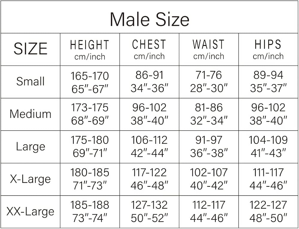 There are only Eight sizes(XS-Custom Made) available, if your size is not in the range of size XS-XXXL(based on US size chart), please choose Custom Made, PLEASE NOTE THAT WE CAN NOT MAKE IT IF YOUR CHEST/WAIST/HIPS SIZE IS EXCEED 135 cm/53 inches.If you choose Custom Made.Please leave us your measurements about gender, height,shoulder width, biceps,arm length, chest, waist, hips